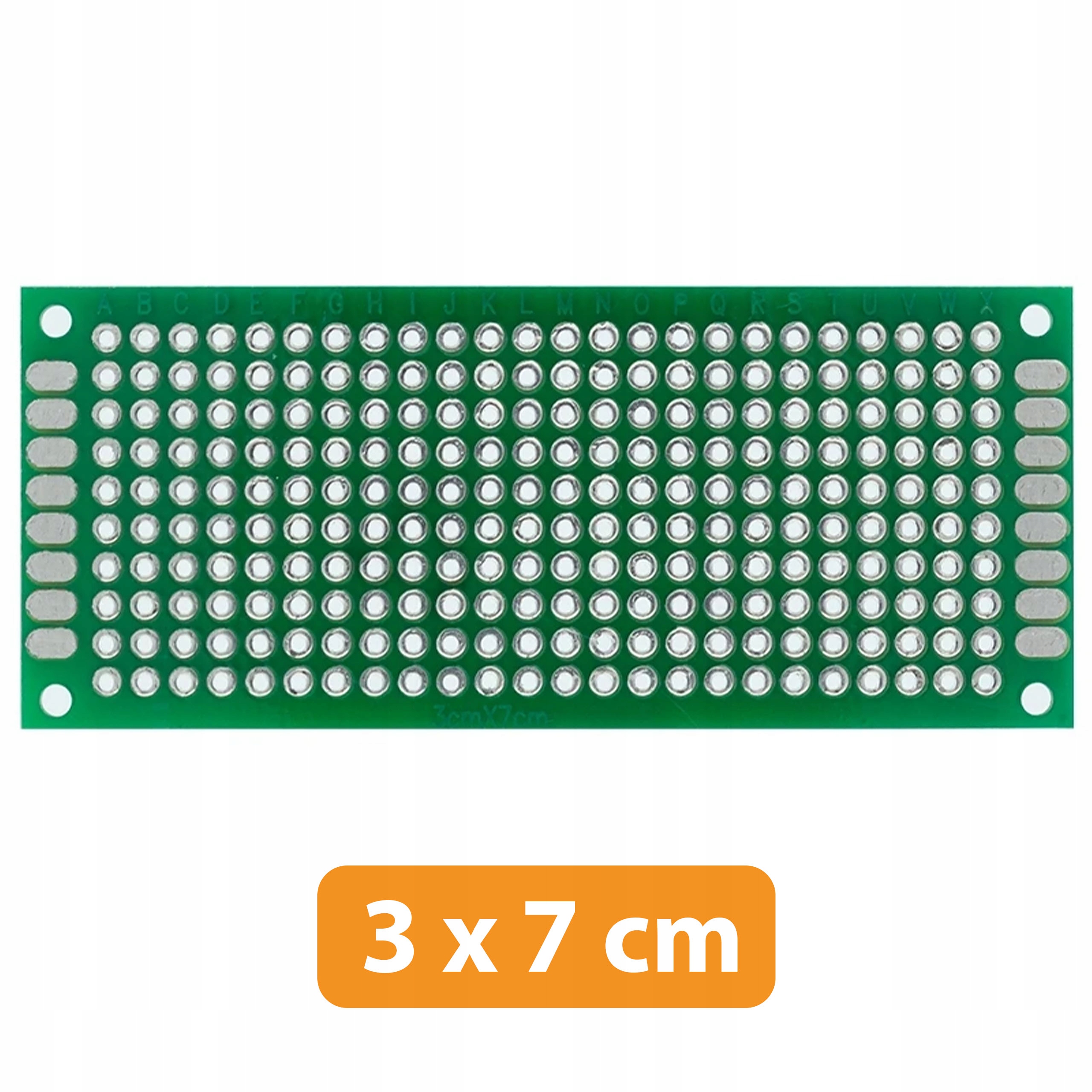 Подвійна універсальна плитка розміром 30 х 70 мм, призначена для побудови прототипів, виготовлених з хронічних елементів (THT), таких як резистори, конденсатори, світлодіоди та інтегровані схеми в корпусах DIP. Плитка дозволяє встановлювати будь -яку електронну систему завдяки отворам 2,54 мм, розташованими в прямокутній матриці.