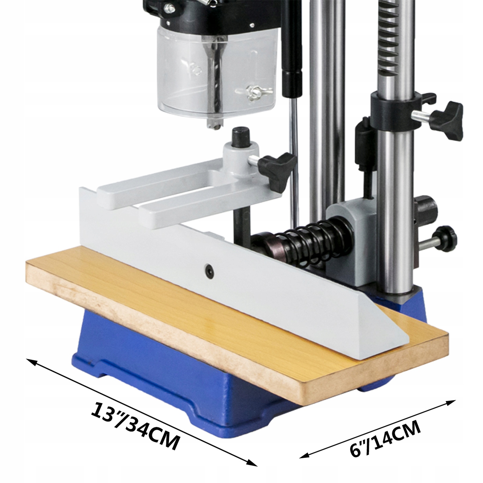 Цей деревообробний верстат для довбування містить 13-міліметровий свердлильний патрон зі стійким свердлом, шип 3/8, тримач зубила, ключ для встановлення затискача свердла та чотири шестигранні ключі .