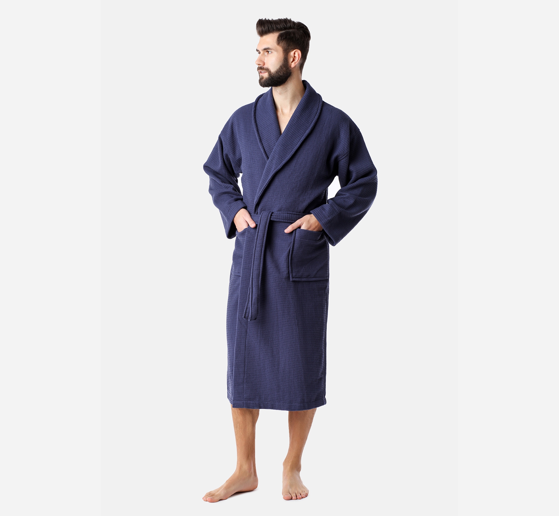 - Чоловічий халат; Вафельний верх, махровий салон; Вага 425 г/м2; Має сертифікати якості: Oeko-Tex Standard 100, Oeko-Tex STeP