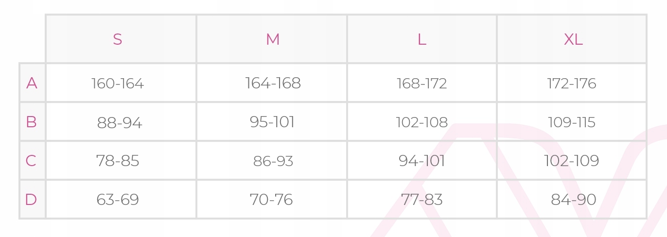 Таблиця розмірів: A: зріст B: обхват стегон C: обхват грудей D: обхват талії