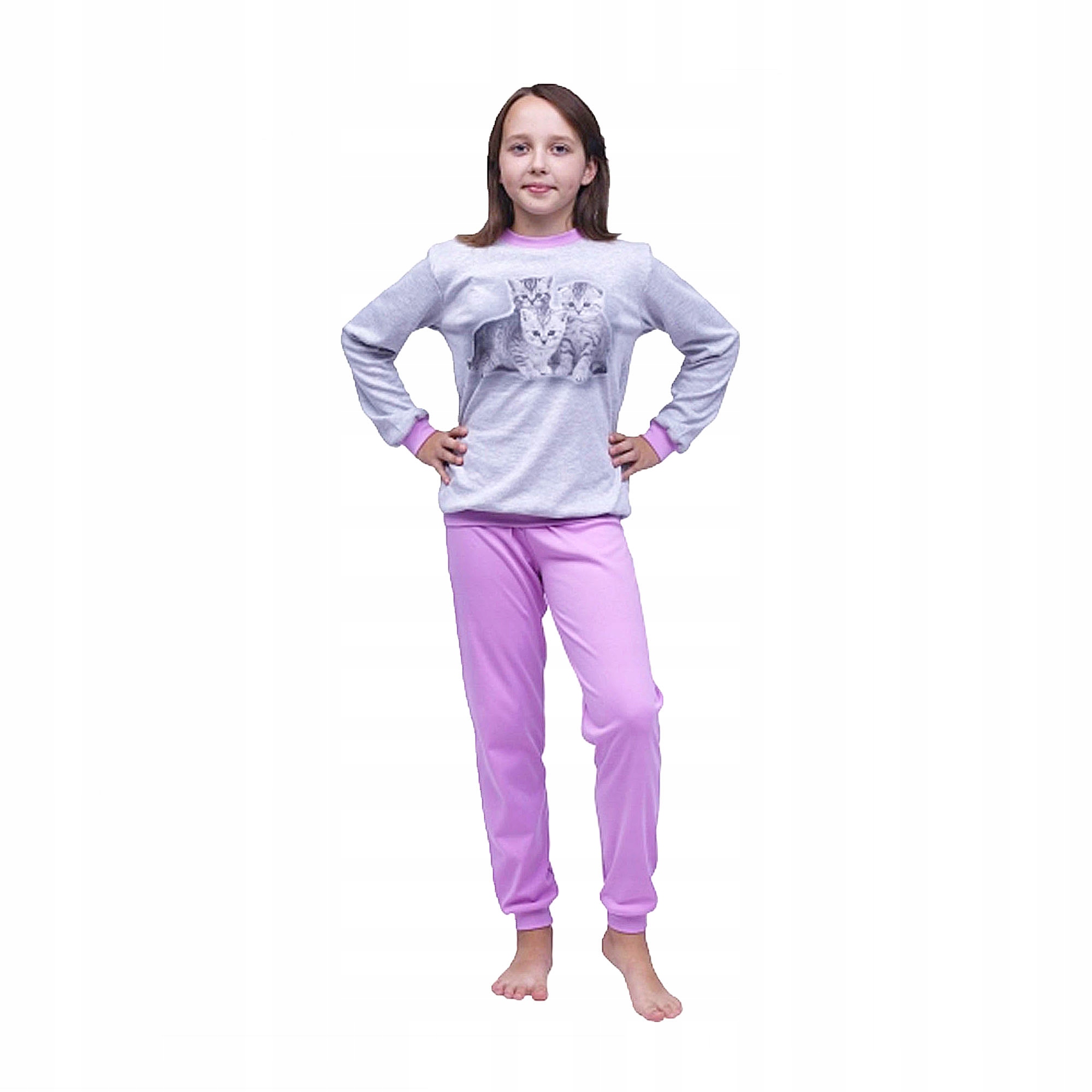 Піжами для дівчаток з принтом кота в модних бузкових і сірих кольорах.