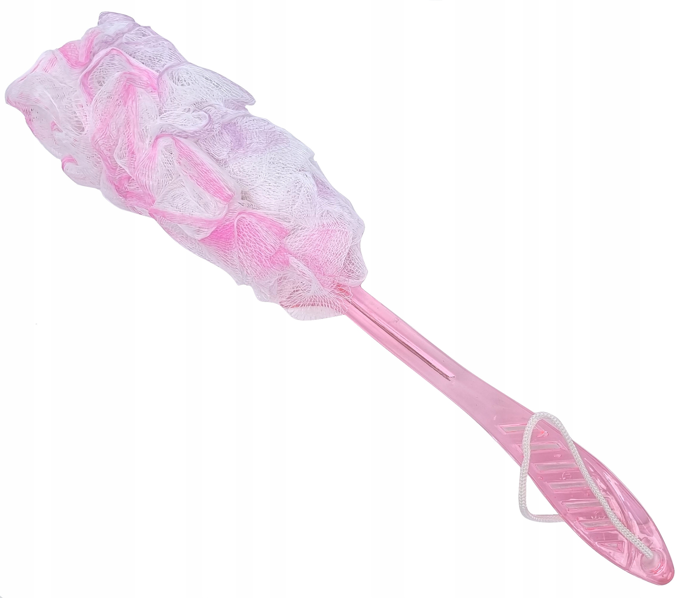 Мочалка зі зручною ручкою ідеально підходить для прийняття душу або ванни. Губка виготовлена з пластикової сітки, яка відрізняється високою міцністю. Губка чудово очищає та масажує, м’яко стимулюючи тіло.