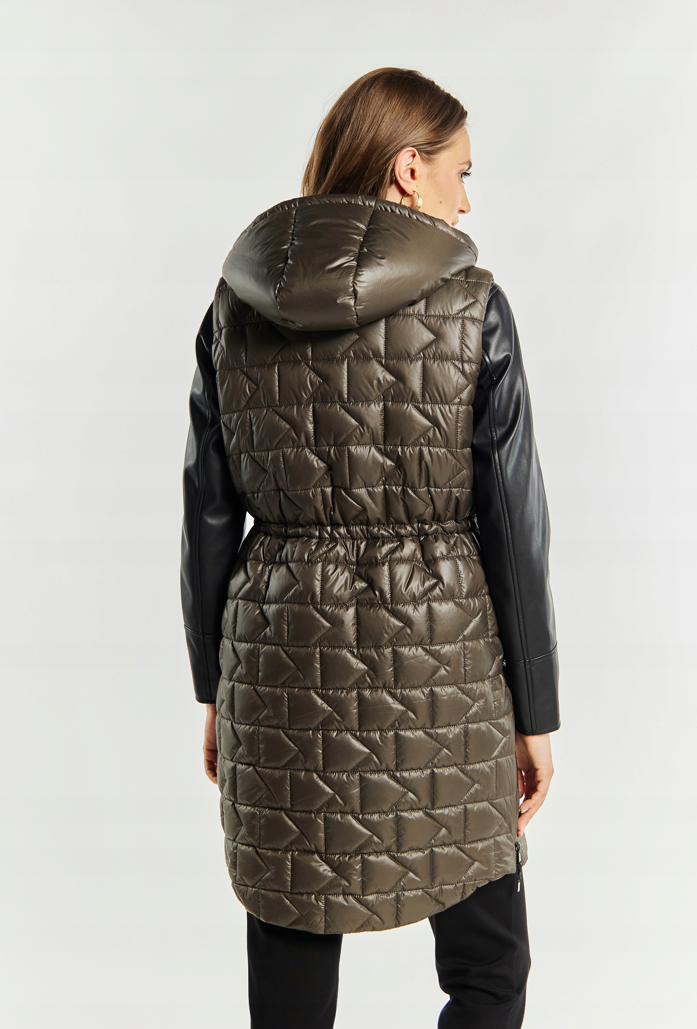 - Жіноча подовжена стьобана жилетка з капюшоном. Жилетка з кишенями, застібками з боків і шнурком на талії неодмінно підкреслить фігуру. Ця модель неодмінно стане основою для повсякденного стилю. Модель на фото має зріст 177 см і носить розмір 36.
