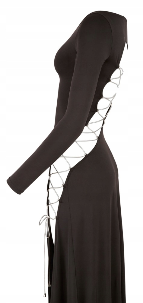 Довга чорна сукня з декоративною шнурівкою на спині і по всій довжині? ліве стегно і закінчується ефектним розрізом. Спина майже не прикрита. Довгий рукав. Склад: 95% поліестер, 5% еластан.