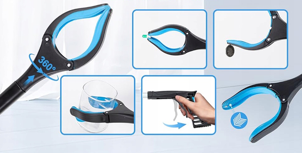 Старший захоплювач із поворотною головкою на 360°, захоплювач для сміття, щоб дістатися в будь-якому напрямку. Захвати для сміття, що захоплюють поверхню обертових губок з протиковзкими частинками, можуть легко затискати предмети з високою несучою здатністю. Щипці для сміття з максимальним отвором щелепи 13 см, вам більше не доведеться нахилятися чи розтягуватися, щоб підняти речі!