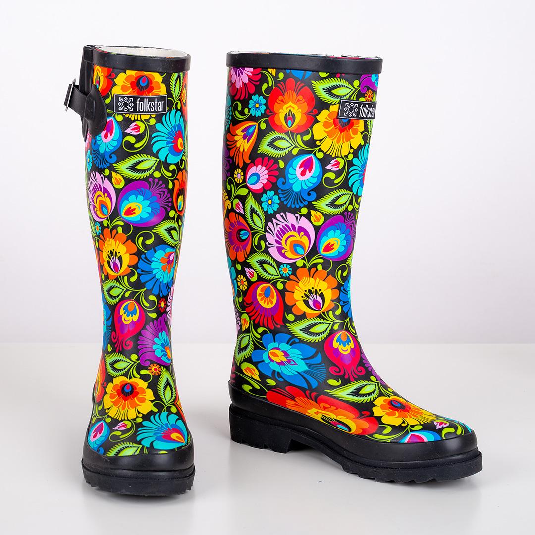 Чорні довгі черевики Wellington від Folkstar, прикрашені квітковим візерунком, натхненним вирізами з паперу Łowicz.