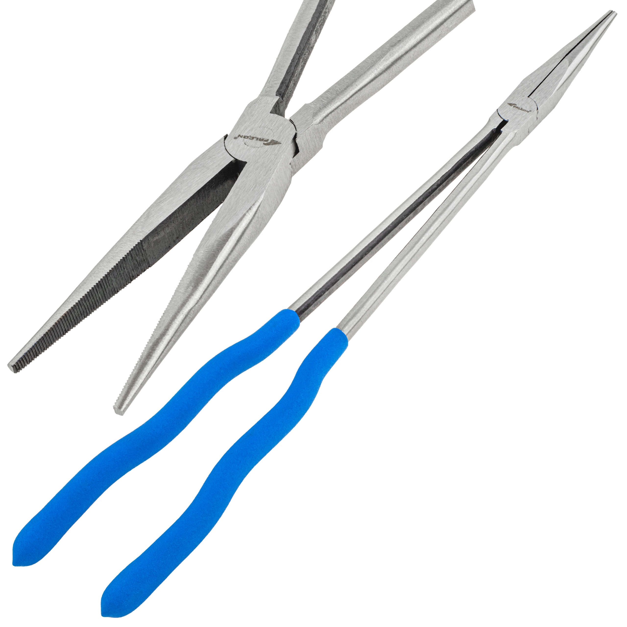 Професійні довгі прямі плоскогубці 400 мм з хромованадієвої легованої сталі (CrV). Призначений для зняття свічок запалювання або розжарювання та ковпачків свічок, гумових і паливопроводів тощо. Ергономічні ручки, що не ковзають, забезпечують міцне захоплення інструменту та зручність використання.