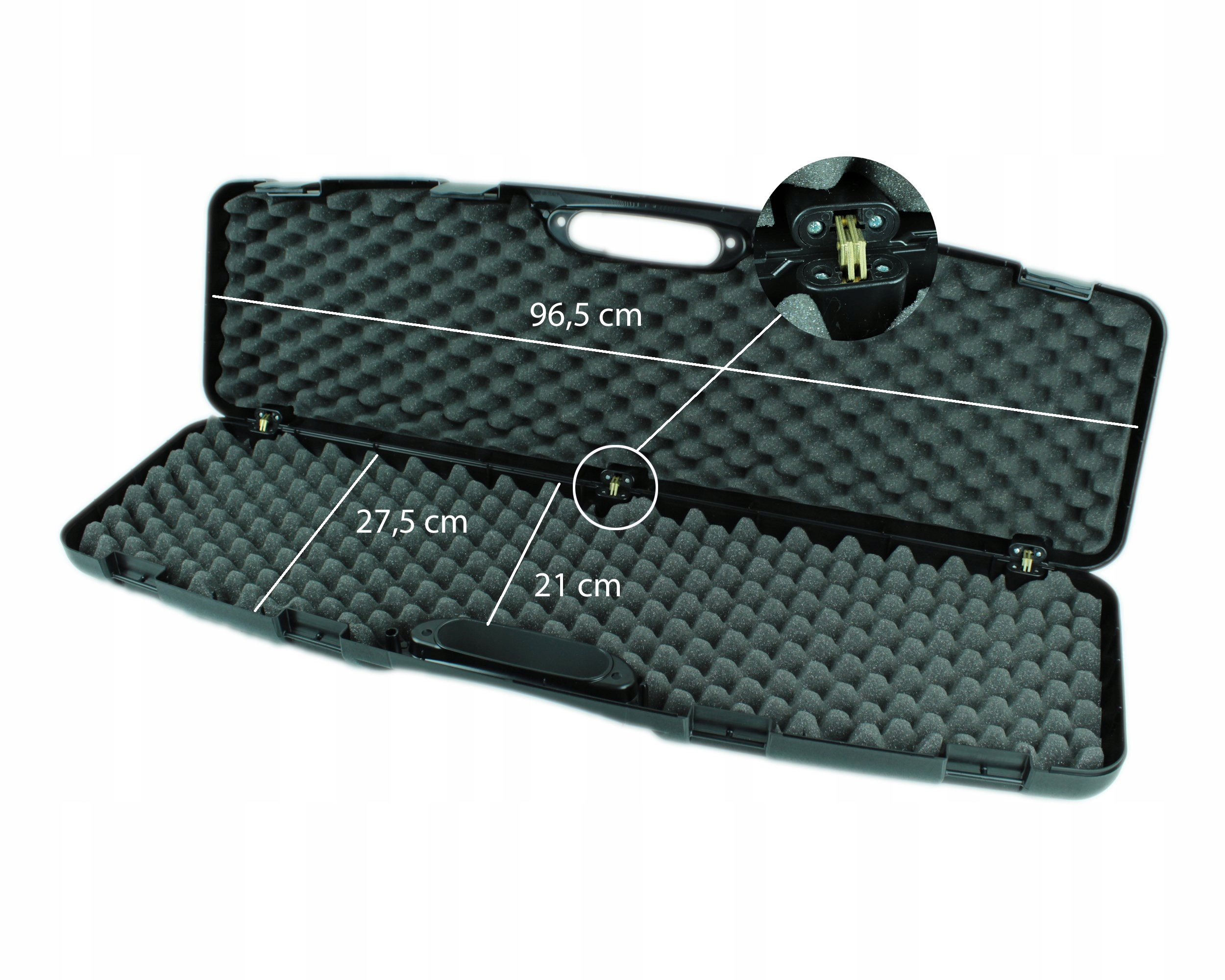 Корпус зроблено в Італії (а не якийсь липкий китайський продукт). Має 3 металеві петлі. Закривається на 4 пряжки для запобігання неконтрольованого відкриття чохла. Наповнювач — бісквіт зі структурою т.зв. акулячі щелепи, які ідеально захищають зброю від переміщення всередині валізи.