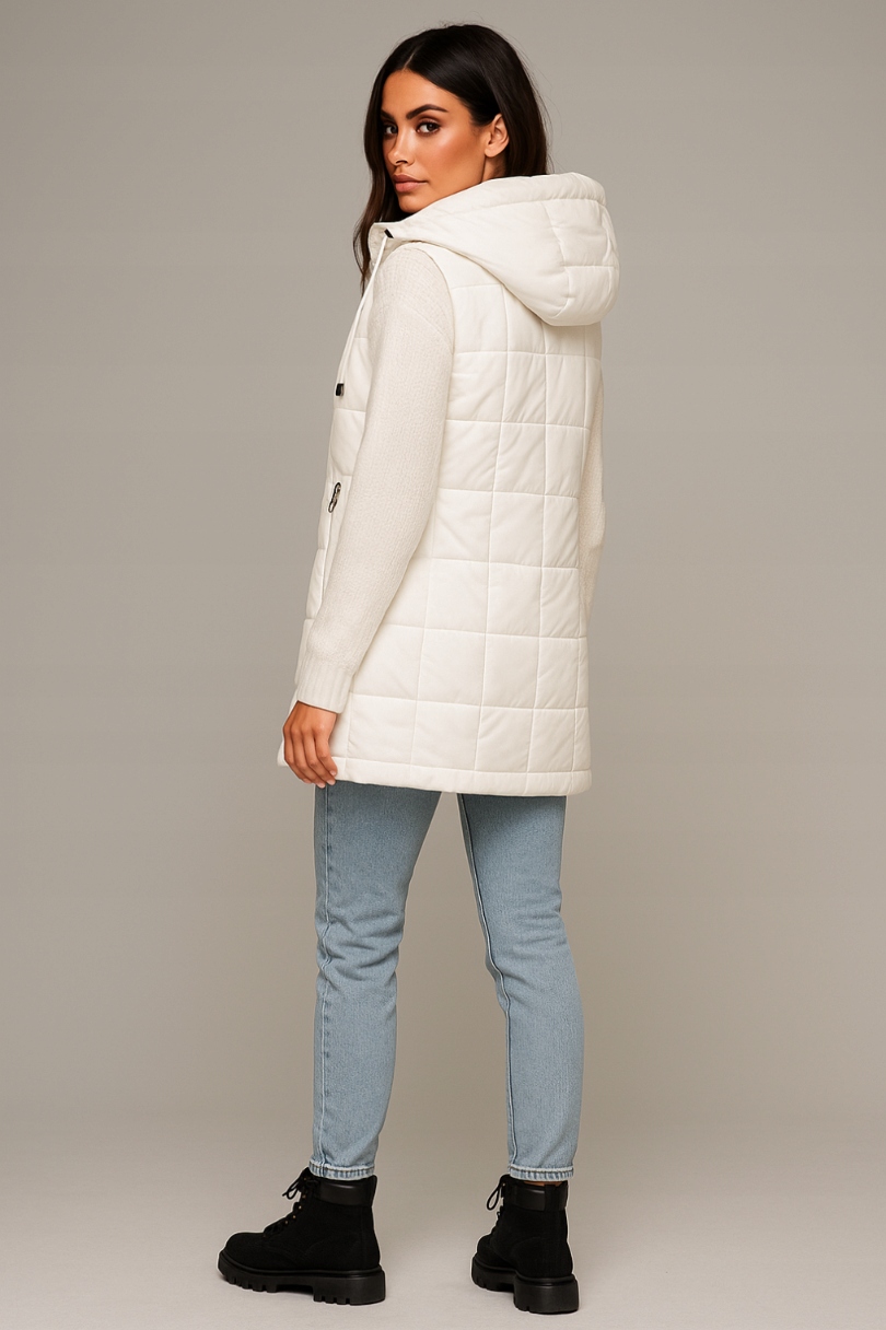 Довгий жіночий жилет - в білому - стьобаний - з капюшоном l