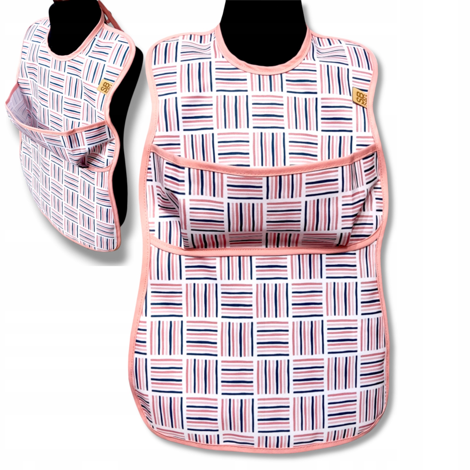 Чохол моделі, верхня частина нагрудника у формі пісочного годинника з відкидною кишенею. Нагрудник був збагачений розширенням, що закриває ноги. Це альтернатива фартухам з рукавами. Його вага набагато легший, ніж вбудований фартух, його легше надягати та чистити. Подовжувач призначений для захисту нижньої частини одягу від падаючої їжі та рідини висипання столових приборів під час шляху від тарілки до обличчя. Він ідеально підходить для ознайомлення з методом BLW, навчання самостійному харчуванню, для святкувань, коли ми хочемо зберегти свій одяг чистим, а також під час ручних та художніх ігор або на кухні. Це модель, яку найчастіше вибирають ясла та дитячі садки.