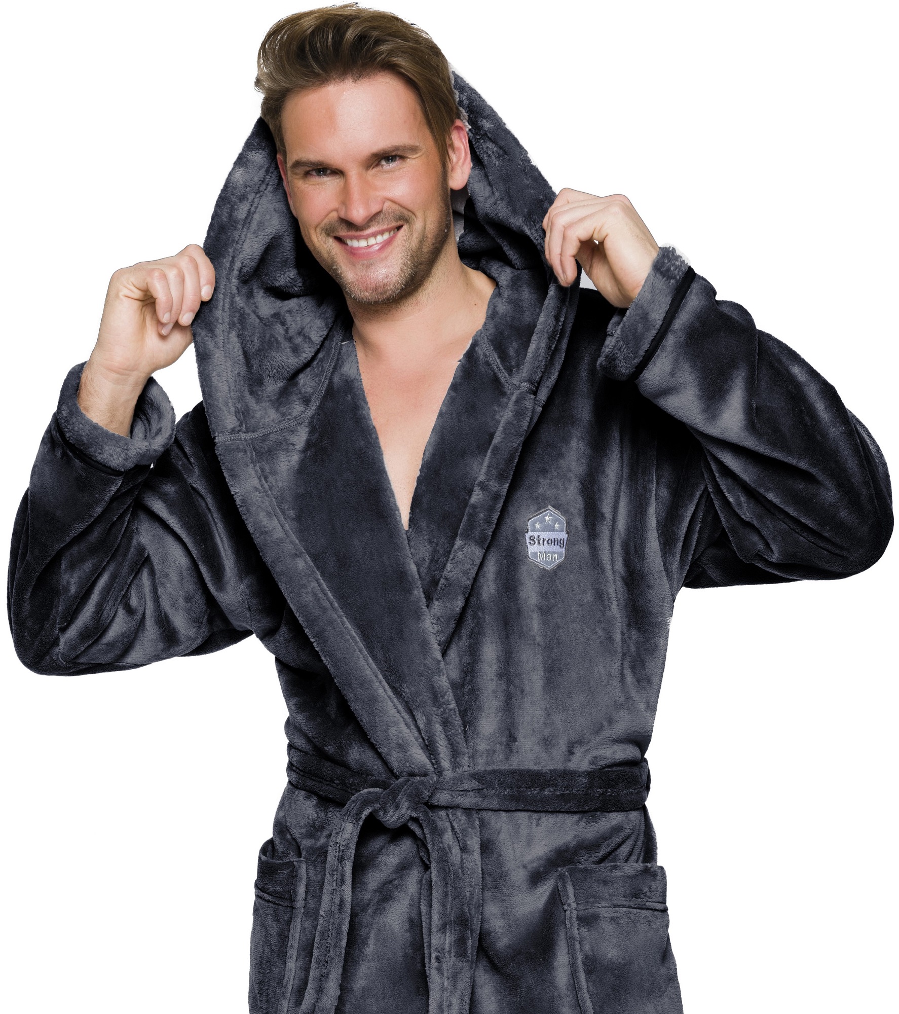 Чоловічий халат з капюшоном, що зав'язується на талії, з м'якої тканини, зовнішні кишені на на стегнах, аплікація на рівні грудей.