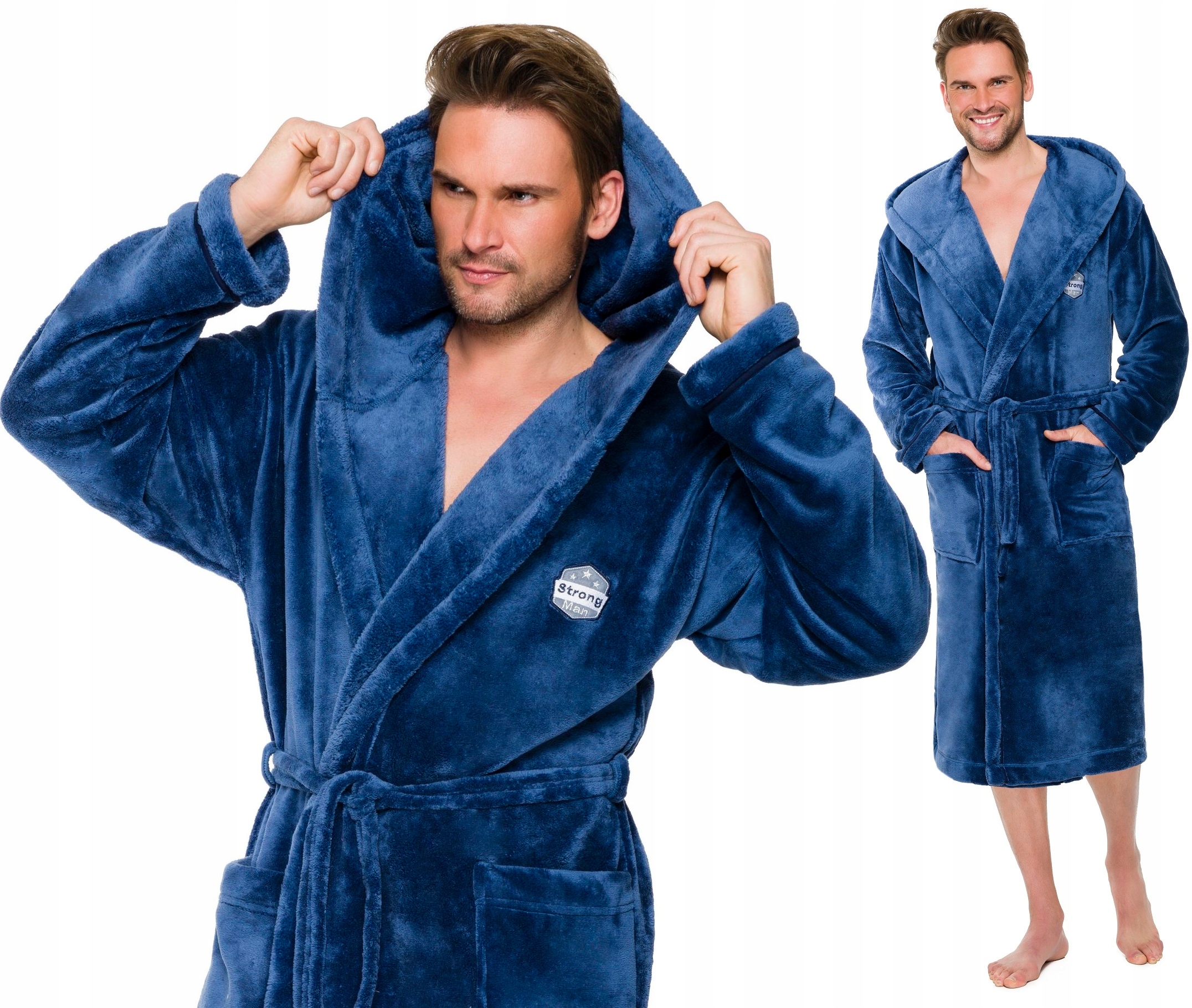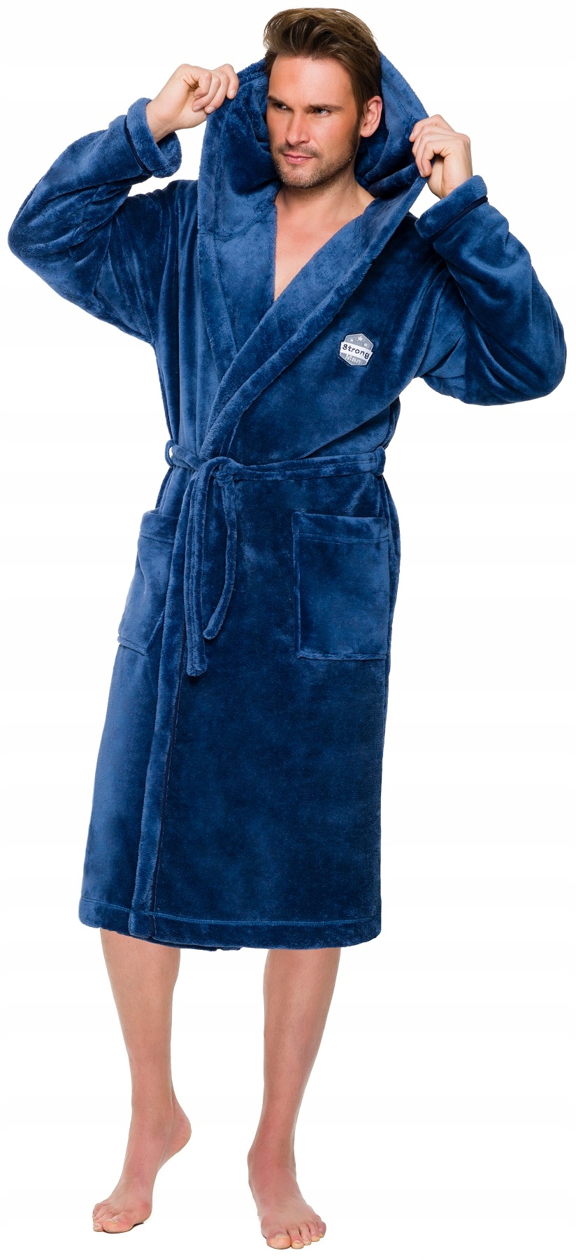 Чоловічий халат з капюшоном, зав'язується на талії, виготовлений з м'яка тканина, на зовнішніх кишенях на стегнах, на рівні грудей пришита аплікація.