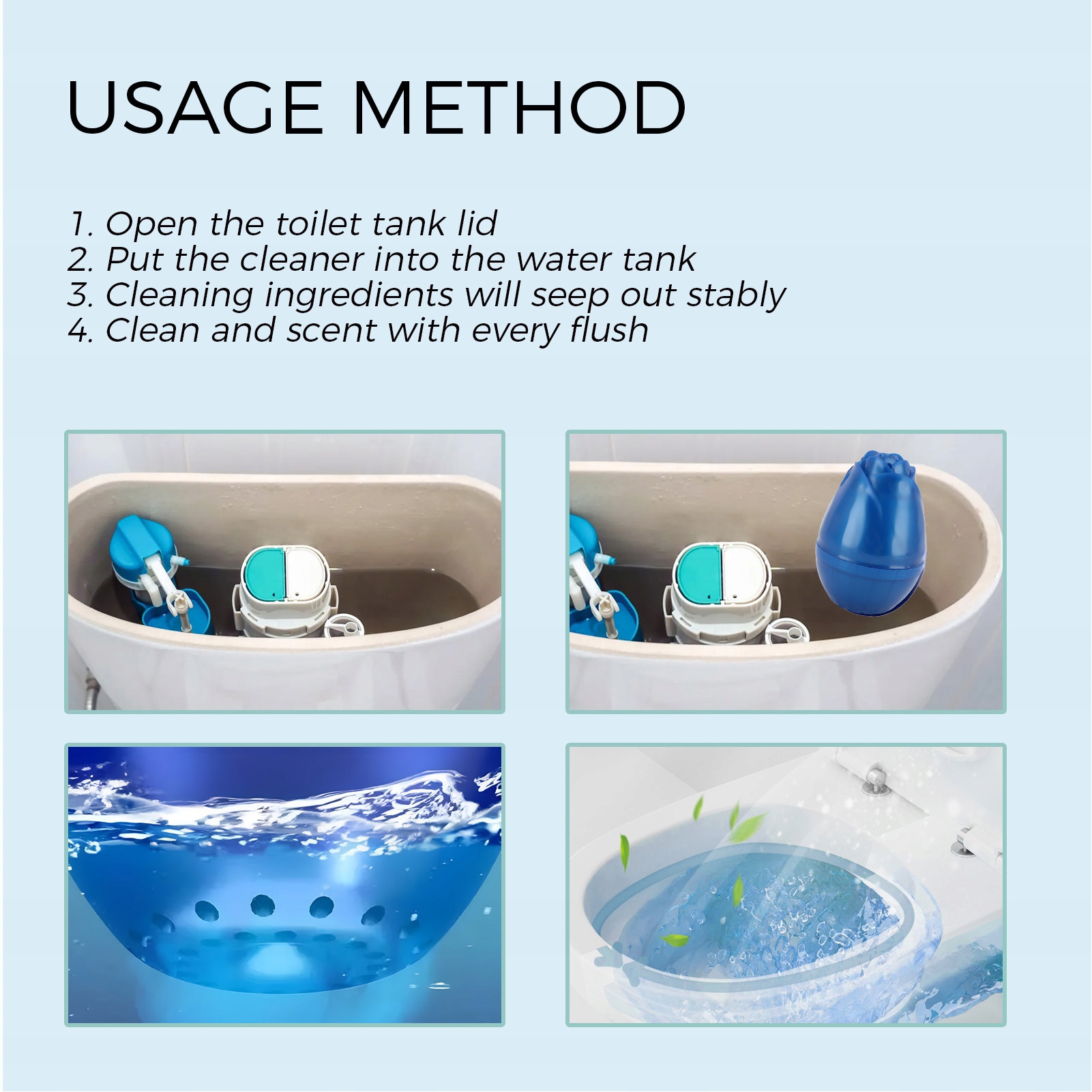 1. Пляшка для очищення бачка унітазу: автоматично очищає всю систему змиву унітазу за допомогою довготривалого аромату. Після використання блакитної туалетної таблетки вона створює товстий захисний шар жиру на бічних стінках, ефективно запобігаючи накопиченню бруду, зберігаючи унітаз чистим і свіжим.