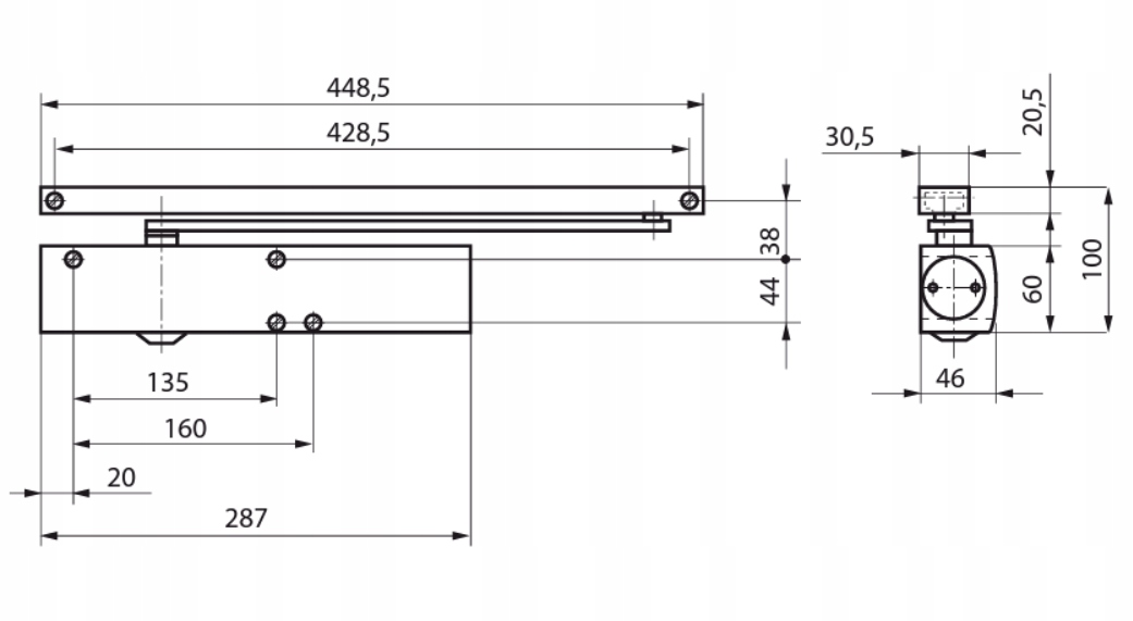 - Дверний доводчик із T-Stop-рейкою, оснащений регульованим обмежувачем відкриття