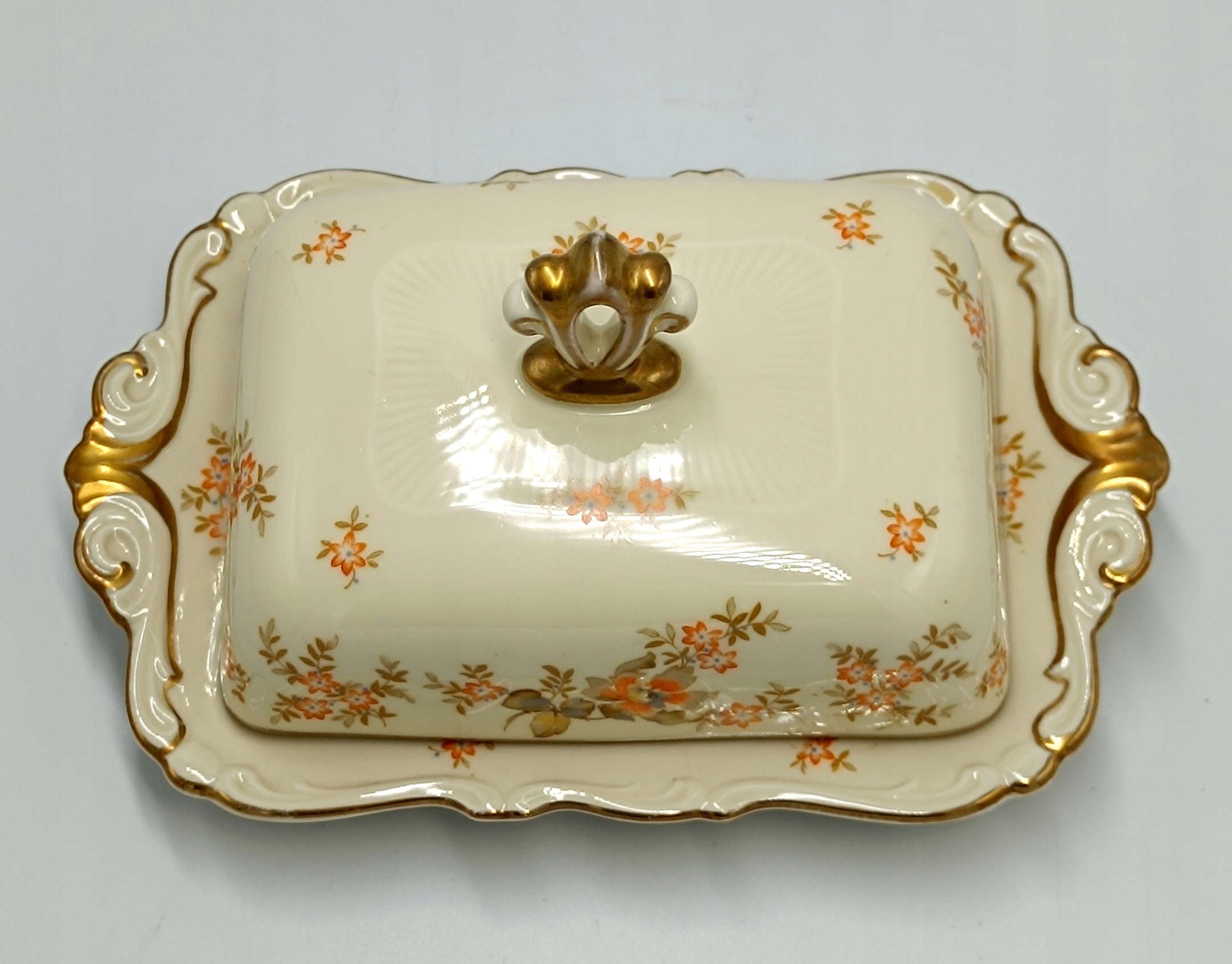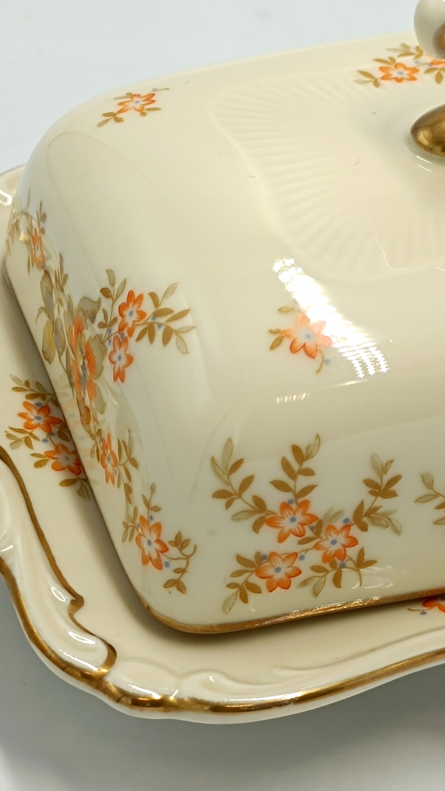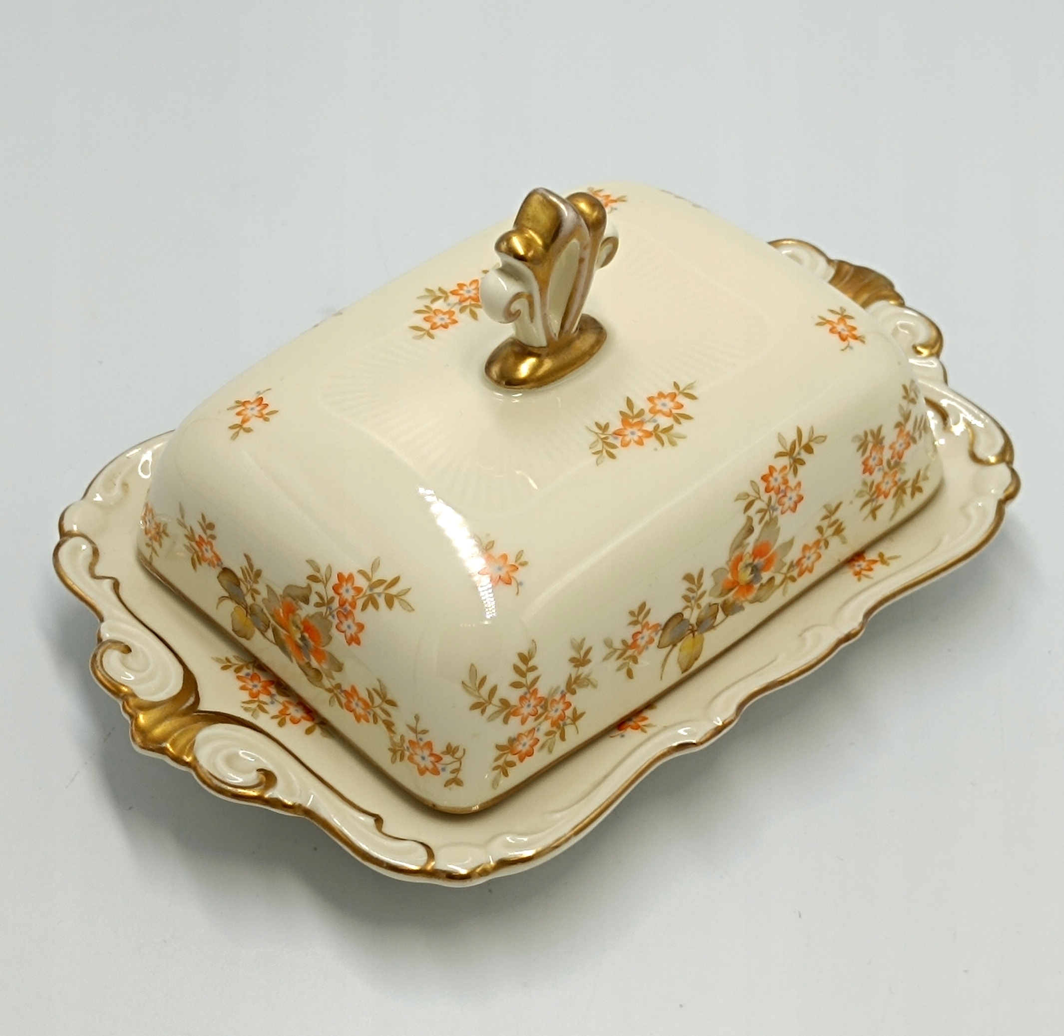 Маслобойка виготовлена з найякіснішої порцеляни кольору екрю з красивим квітковим декором помаранчевого кольору, що дуже рідко зустрічається. Краї основи маслобійки дуже витончено профільовані та позолочені. Його ручка також дивовижна. Знизу розміщений підпис із зазначенням року виробництва 1925-1945