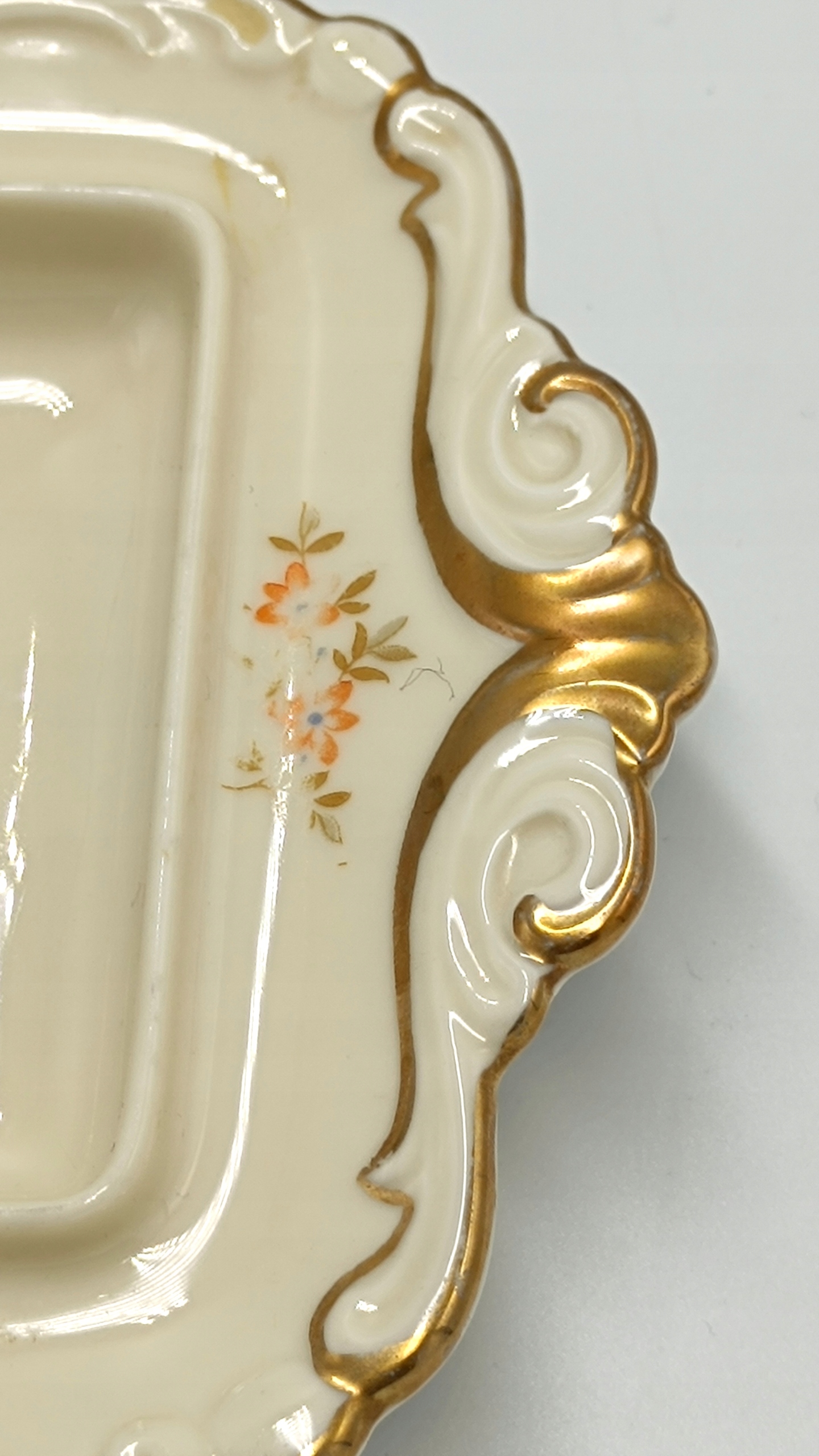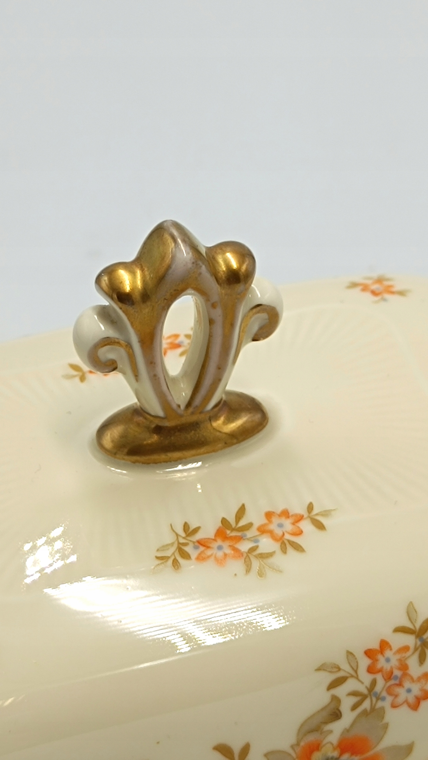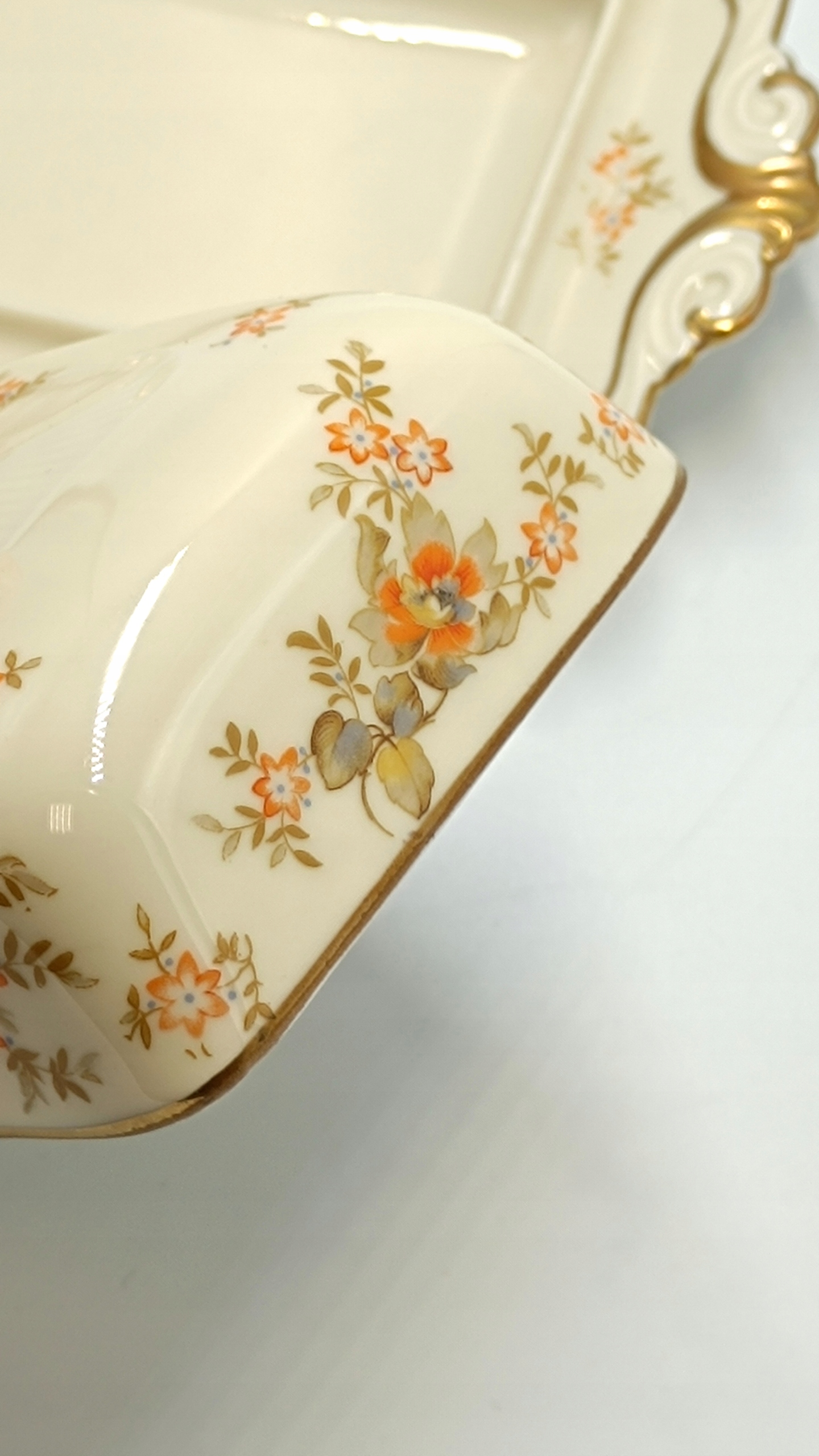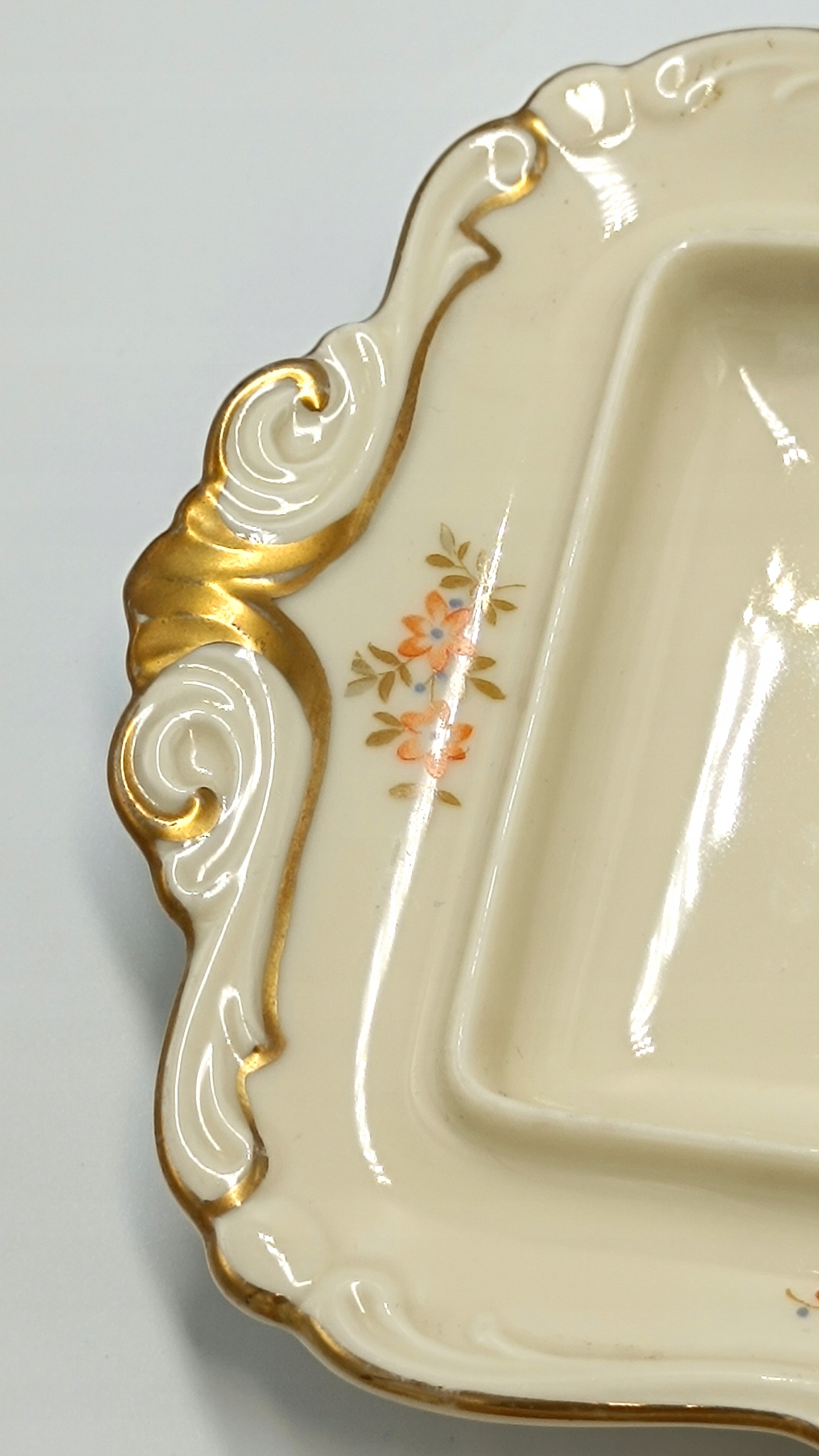 Маслобойка виготовлена з найякіснішої порцеляни кольору екрю з красивим квітковим декором помаранчевого кольору, що дуже рідко зустрічається. Краї основи маслобійки дуже витончено профільовані та позолочені. Його ручка також дивовижна. Знизу розміщений підпис із зазначенням року виробництва 1925-1945