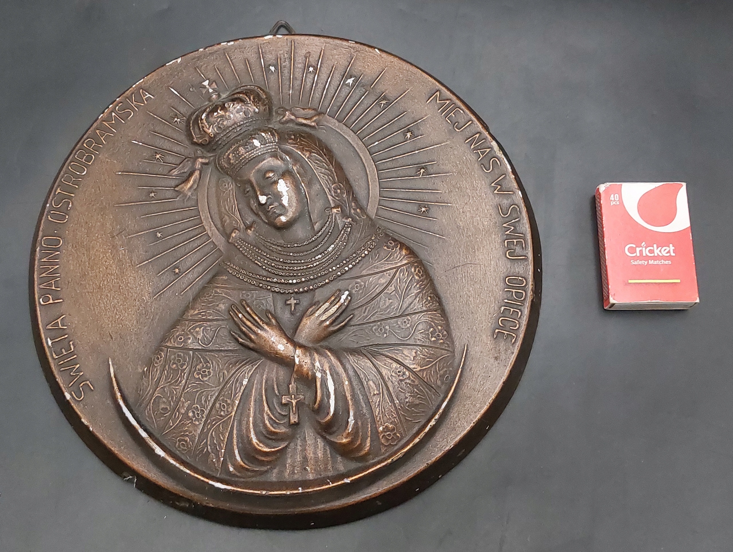 Довоєнна гіпсова дошка із зображенням Богородиці Надбрамної. Діаметр 22 см. Дуже ретельна робота. Стан видно на фото - бейдж має численні поверхневі потертості. На нижній кромці (прилягає до стіни) є дефекти (див. фото). Все-таки грішити варто. Ласкаво просимо!!!