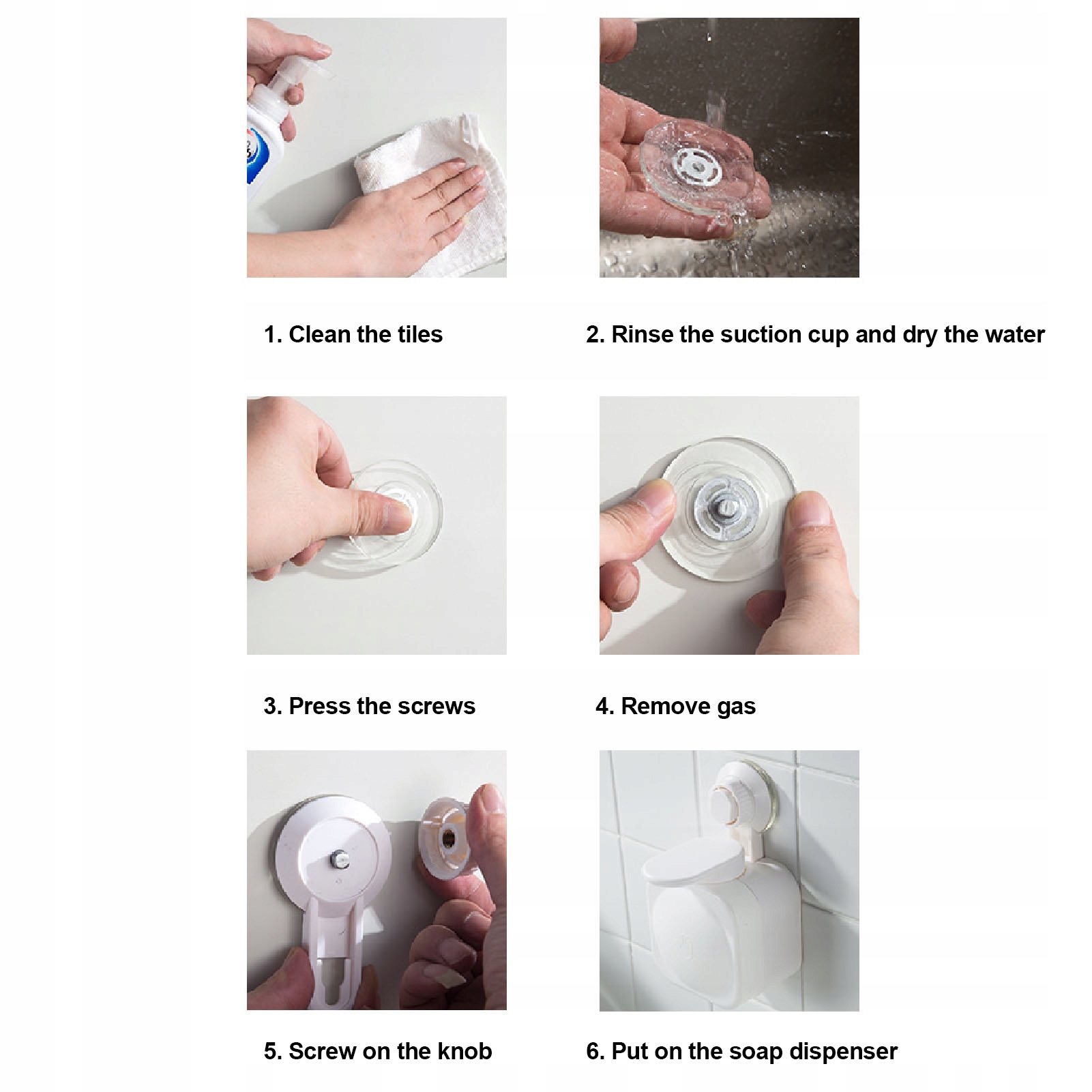 1. Згладжування поверхонь, очистіть стіну, промийте присоску, висушіть воду, натисніть на гвинт, очистіть газ, гвинти на ручці, помістіть дозатор для мила, закріпіть його на стіні на 12 годин, потім використовуйте знову (це може зробити присоску міцнішою), вона може витримати вагу 3 кг.