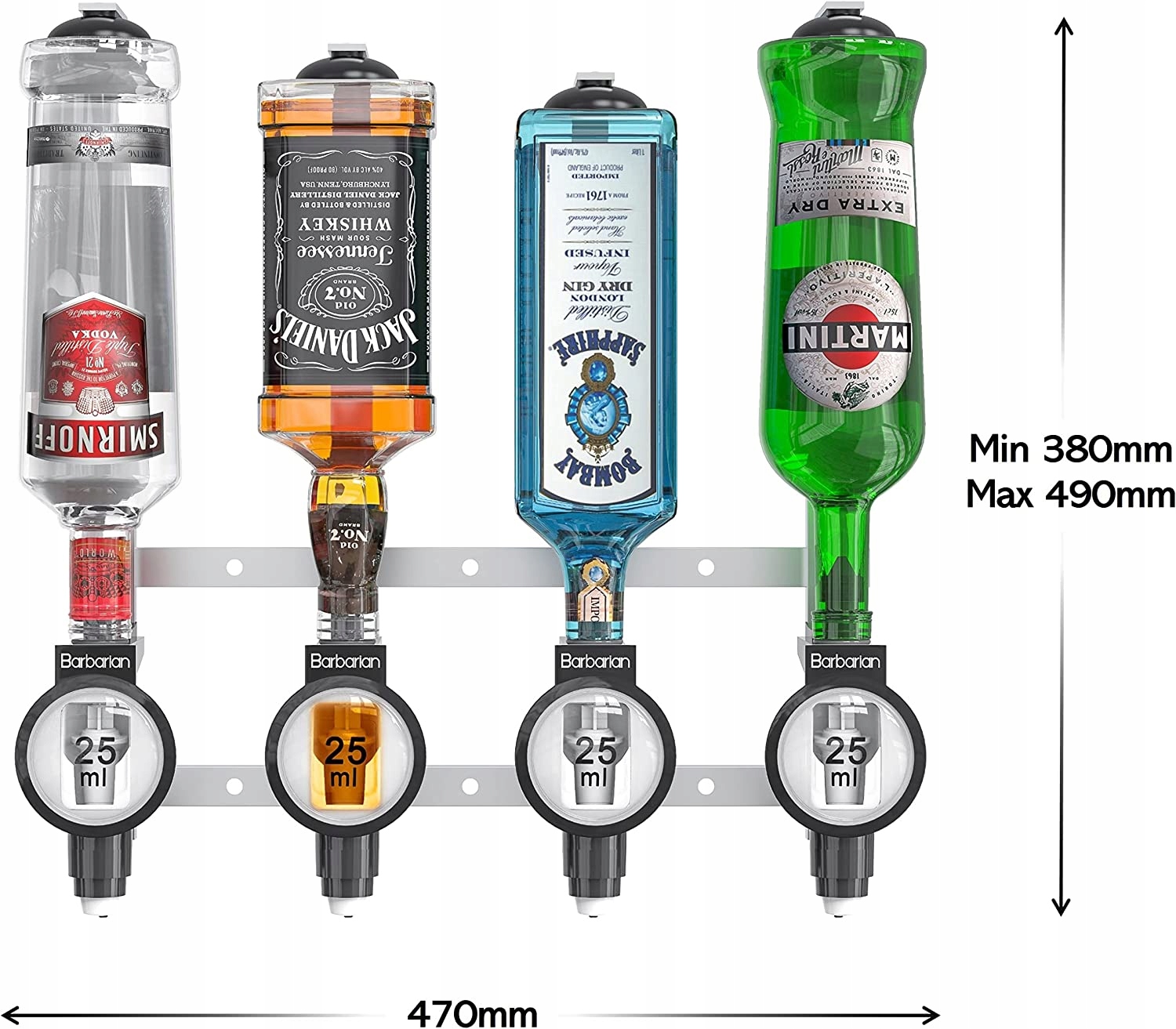 4-ступеневий дозатор алкоголю Barbarian - чудовий спосіб пити. Чотири пружинні плечі міцно тримають пляшки об’ємом 70 мл або 1 літр, готові до подачі.