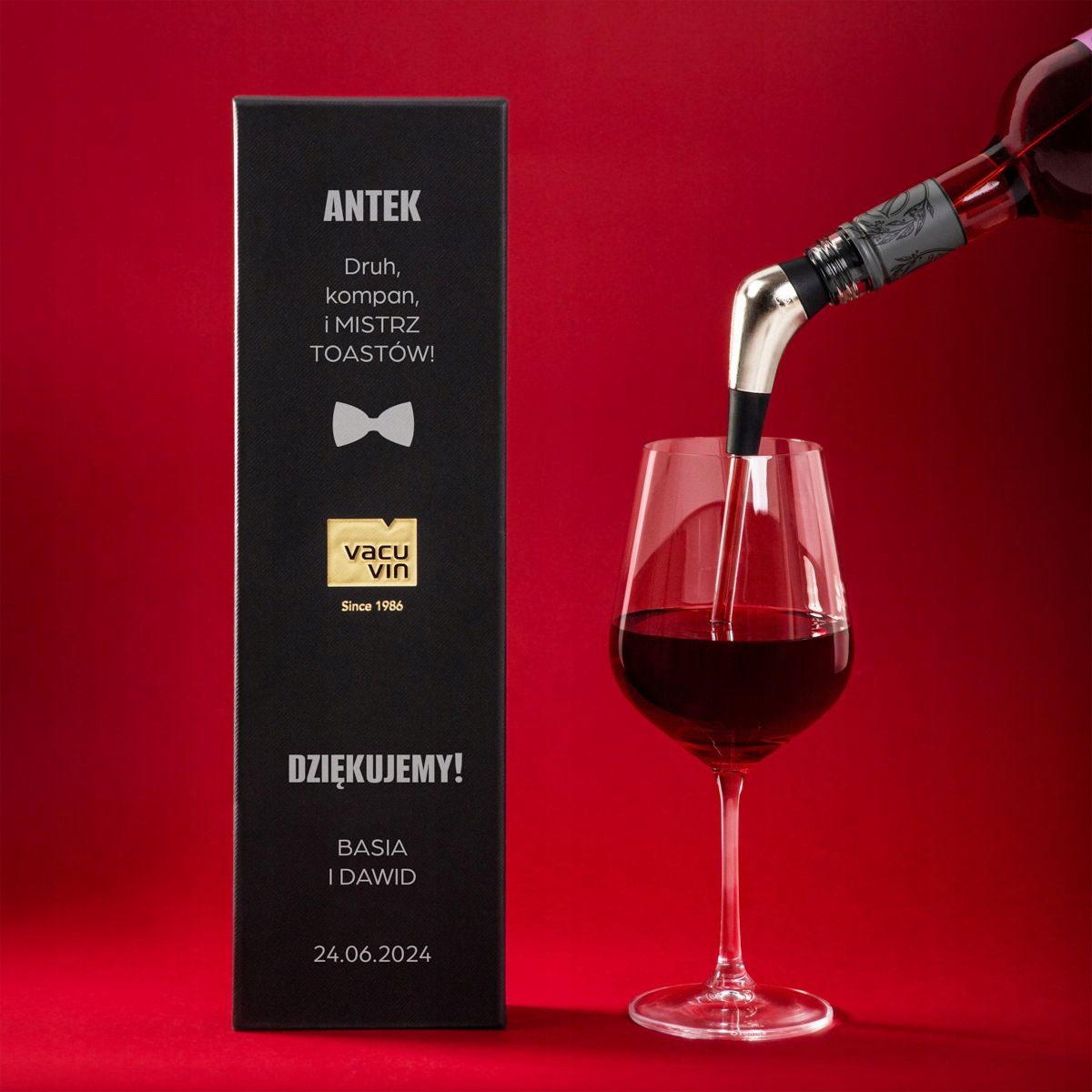 Наливка для вина VACU VIN 36,7 см має персоналізацію, що робить її ідеальним подарунком для молодої пари. Виливник виготовлений з високоякісного металу, що забезпечує довговічність виробу. Його елегантний чорний дизайн робить його чудовим доповненням до вашого домашнього обладнання для бармена. Завдяки практичним розмірам і міцній конструкції він є незамінним інструментом для любителів вина.