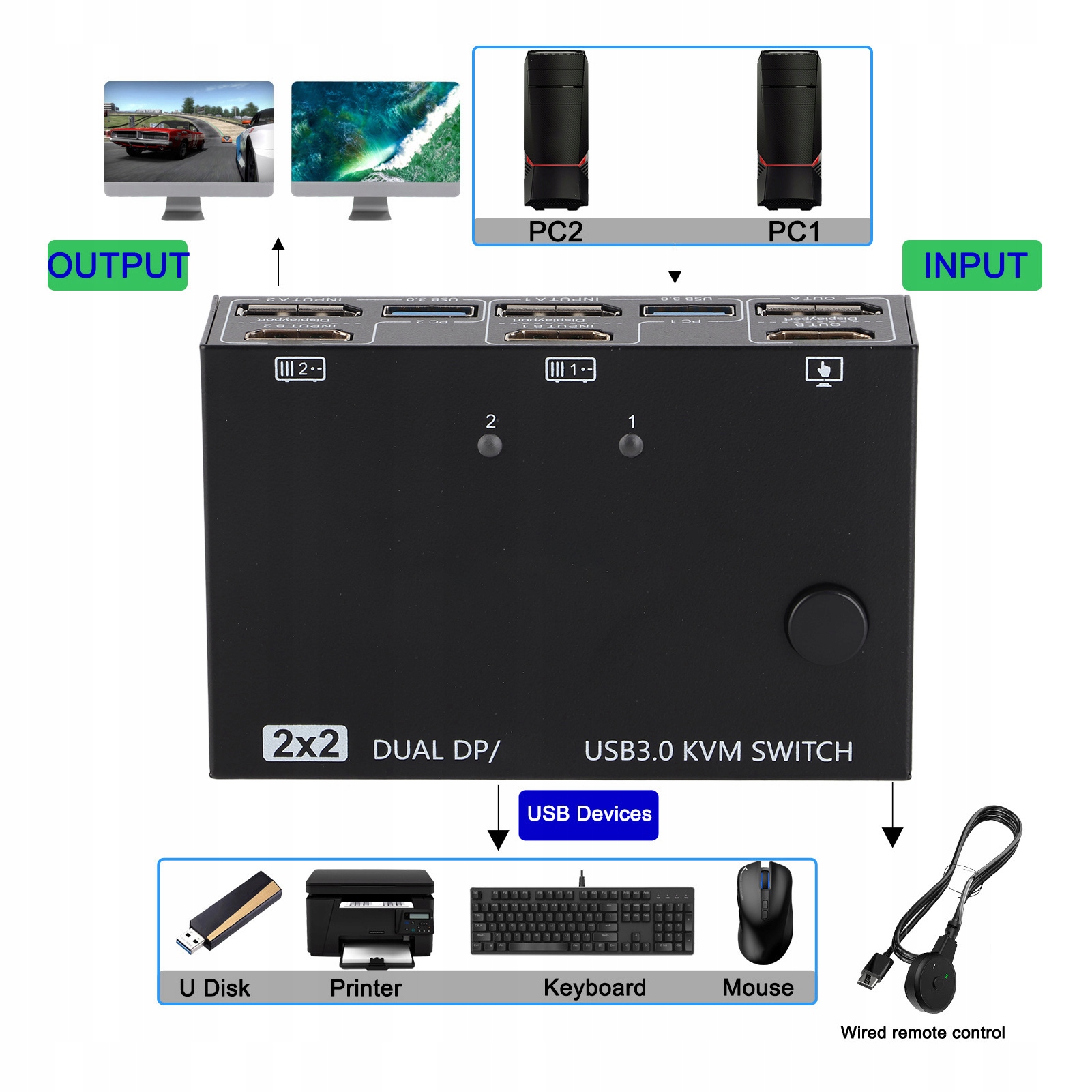1. Він перетягує два дисплеї: KVM Survivor ковзає як фізичні клавіші, так і провідний контроль. Використовуйте цю прокладку, щоб два комп'ютери покривали два монітори, лише якщо комп'ютер має справу з двома дисплеями або багатьма моніторами. Подвійний режим: Survivor KVM для пристроїв з мультимедійним інтерфейсом DP та HD Multimedia Coole Mouse та Monitor. У режимі копіювання екран лайна може бути скопійований на другий вихідний екран. У розширеному режимі вікно з лайна можна перетягнути на другий вихідний екран. Розвезення сну: USB KVM Survivor ковзає високу роздільну здатність 4K 60 Гц, 1440 P 165 Гц, 144 Гц, 120 Гц, 60 Гц, 1080 P 165 Гц, 144 Гц, 120 Гц, 60 Гц. Резолюція 60 Гц. USB 3.0: Це інтерфейс KVM з мультимедійним інтерфейсом DP HD 2 та 2 входами та 2 виходами з додатковим портом USB 3.0 для спільного використання миші, клавіатури, USB -принтерів, сканера тощо.