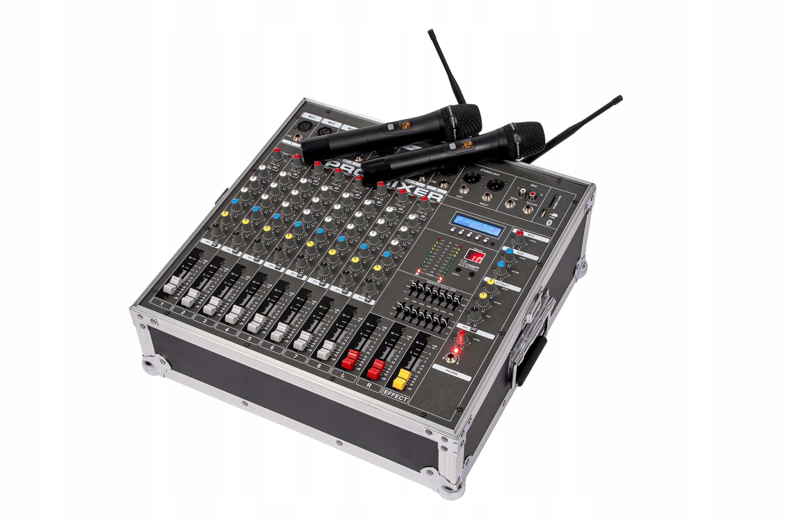 Професійний змішувач з підсилювачем, PowerMixer, Power 2 x 500W RMS, оснащеним 8 мікрофонними каналами, лінійним входом з ноутбука, телефону, USB, Bluetooth та 2 бездротових мікрофонів із вбудованим подвійним приймачем. Вам не потрібно підключати приймач мікрофона окремо до змішувача, що дуже зручно. Дуже простий у використанні. Все закрито в дуже суцільній фанерній коробці з металевою фурнітурою. Верхня кришка видаляється.