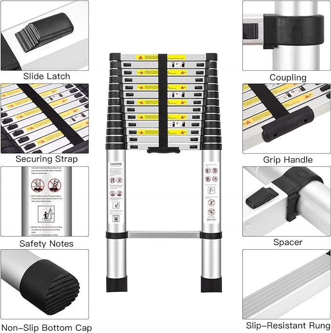 ✔ ✔ ✔ Висувну драбину, прив’язану фіксованим ременем, легко піднімати та дуже зручно носити, куди б ви не пішли. Драбину також можна розмістити в багажнику або в різних кутках будинку, як вам заманеться.