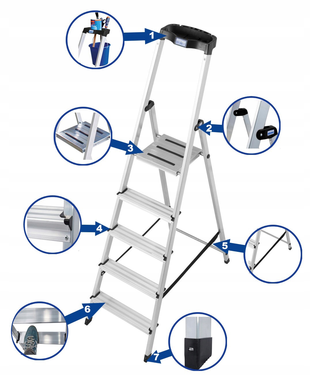 Алюмінієва вільна драбина з серії Krause Monto, адаптована , в першу чергу для використання всередині. Стабільна конструкція та Додаткове обладнання як: висока пов'язка на голову, ергономічна полиця інструментів, гачок відра та дві кабельні ручки, підкреслює його функціональність та безпеку.
