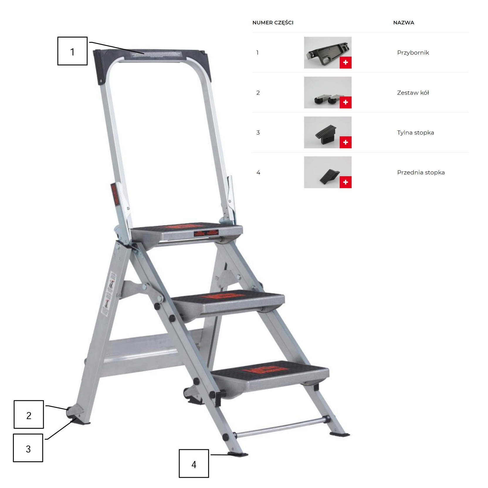 Складний поручень забезпечує безпеку, крім того, версії 3-х і 4-х сходинкових сходів мають полицю для інструментів, встановлену на поручні.