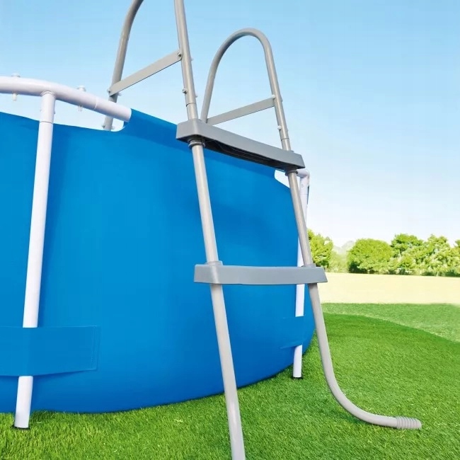 Сходи для садового басейну Bestway. Сходи дозволяють вільно входити в басейни, висота яких не перевищує 84 см. Сходи двосторонні і ми розміщуємо її над краєм басейну. Протиковзкі сходинки гарантують безпечний вихід із води.