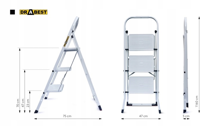 Сходи DRABEST призначені для використання в офісах, будинках, магазинах і складах. Ідеально підходить для щоденної роботи на невеликій висоті.