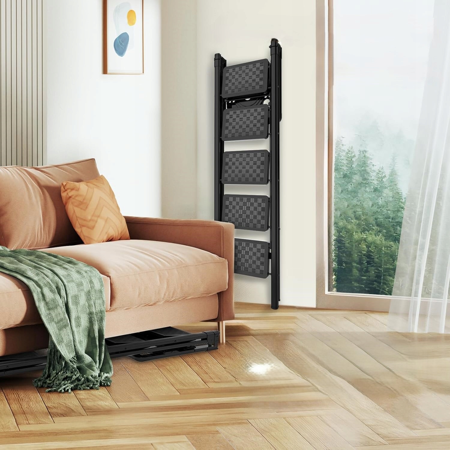 Драбина має 5 сходинок, що полегшує підйом і перенесення. Широкі сходинки, вкриті нековзкою гумою, забезпечують стабільну підтримку від п'яти до пальців. Великі гумові ніжки міцно прилягають до підлоги та захищають її від подряпин.