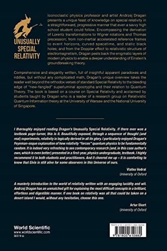 Професор іконоборчої фізики та художник Анджей Драган представляє унікальне свято знань про особливу відносність прямолінійною, прогресивно, до якої міг слідувати навіть кмітливий учня середньої школи. Acunies Виведення перетворень Лоренца до обертання Вінгера та прецесії Томаса; Від неінтертеальних прискорених референтних рамок до горизонтів подій, вигнутих простору та статичних чорних отворів; І від ефекту Доплера до релятивістської структури електромагнетизму, Драган відбиває загадкові шари сучасної фізики, щоб забезпечити глибоке розуміння новаторської теорії Ейнштейна. Комплексний та елегантно написаний, сповнений проникливих очевидних парадоксів та загадок, але без жодної складної математики унікальний огляд Драгана виводить читача за межі православних віршів стандартної спеціальної відносності до краю кровотечі краю кровотечі "новоспеченого" апокрифу суперлюміну та їх відношення до квантової теорії. Книга заснована на курсі з питань спеціальної відносності та визнаних студентами, які шукали Драган, який є лідером дослідницької групи з релятивістської теорії квантової інформації Варшавського університету та Національного університету Сінгапуру.