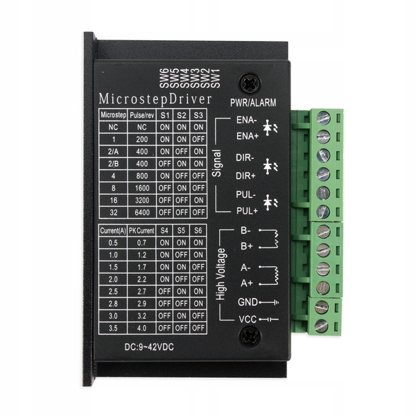 ⭐ Пристрій можна використовувати в двигунах з різною потужністю: від NEMA17 до NEMA24, це забезпечує вісім налаштувань струмувід 0,5A (0,7A в імпульсі) до 3,5A (4,0A в імпульсі) і сім налаштувань поділу кроків .