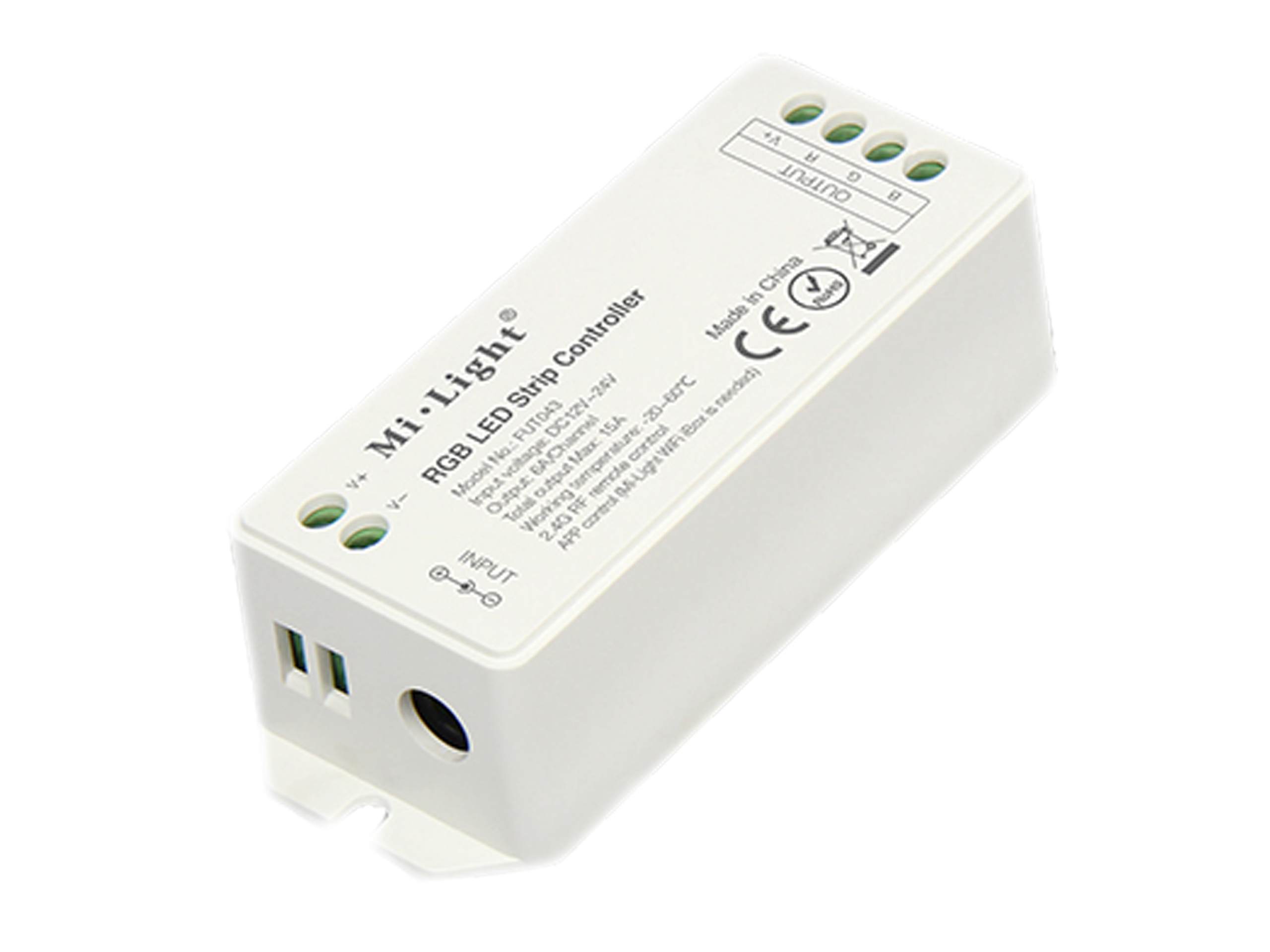 Останній радіоконтролер MiLight FUT043 2,4 ГГц призначений для керування RGB-світлодіодними стрічками з напругою живлення 12-24 В постійного струму (тільки контролер, без дистанційного керування). Максимальне навантаження драйвера становить 6 А на канал і 15 А на драйвер. Контролером можна керувати за допомогою пульта дистанційного керування з набору FUT043a (пульт дистанційного керування на фото нижче), а також за допомогою смартфона (вам також потрібен роутер iBox, доступний на інших наших аукціонах - тоді використовуйте опцію FUT089 або FUT092 для керування ним) або за допомогою пульта дистанційного керування MiLight B0 (також доступний на інших наших аукціонах).