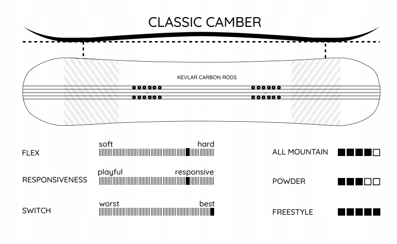 Дошка була розроблена для того, щоб забезпечити сноубордистів стабільним та деяким почуттям на дошці під час швидкого водіння або стрибків на велику відстань. Класичний Camber забезпечує найкращу поп, завдяки цій традиційній конструкції.