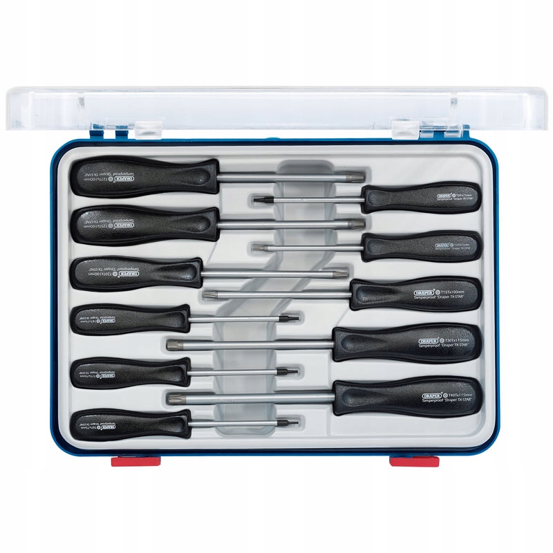 Викрутки Draper TX-STAR сумісні з системою кріплення Torx. Леза виготовлені з хромованадієвої сталі, загартовані та загартовані з хімічно зачорненим кінчиком. Квадратні чорні матові ручки з ударостійкого пластику. Виріб упакований в пластикову коробку з прозорою кришкою і вкладишем. Вміст: T6T, T7T, T8T, T9T, T10T, T15T, T20T, T25T, T27T, T30T і T40T.