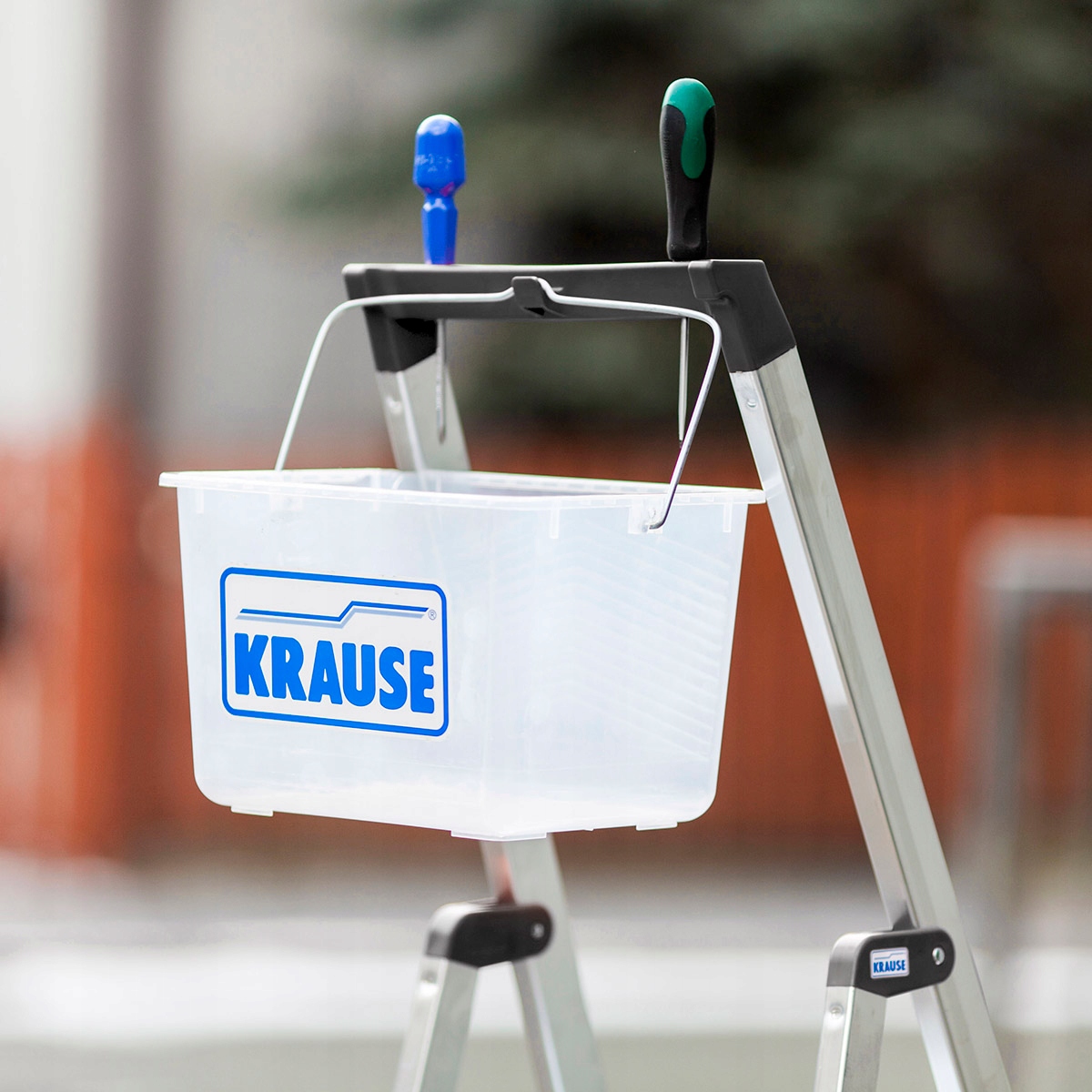 Драбина закінчується зручним контейнером для дрібних предметів (гвинти, гайки тощо), з отворами для викруток і гачком для відра (відро та інструменти видно на фотографії не є частиною пропозиції).