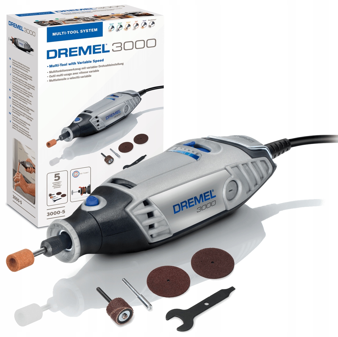 - Цей набір включає багатофункціональний інструмент Dremel 3000 і 5 оригінальних аксесуарів Dremel.