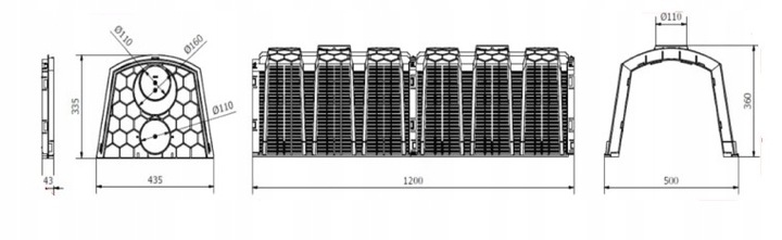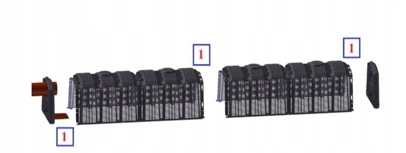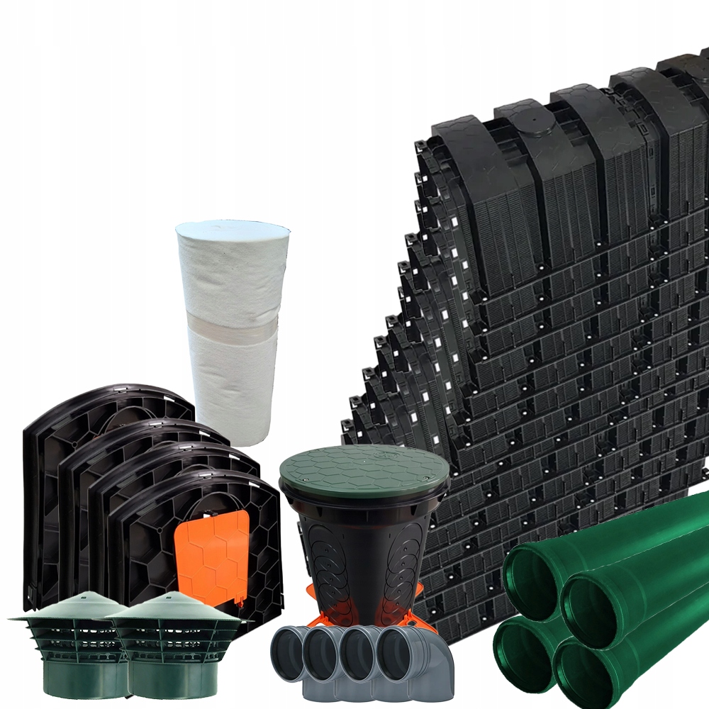 Налаштування для дощової води та очищеної стічної стічної води. Система складається з одного або багатьох модулів та двох закриття елементів, що характеризуються простотою вибору. Прокладка відбувається в одному шарі, в поздовжньому напрямку, що дозволяє легко адаптувати форму та здатність до місцевих умов. Дренаж стічних вод відбувається безпосередньо до землі через порожнє дно і зазори на бічних стінах.
