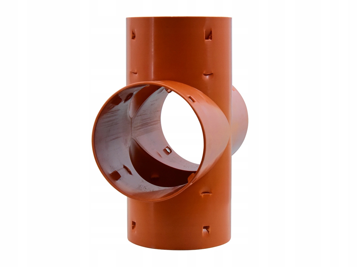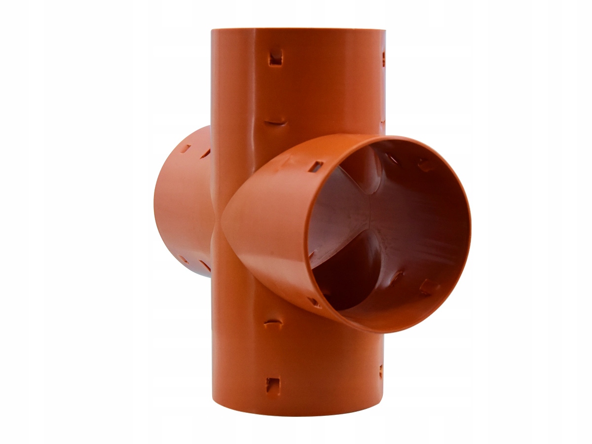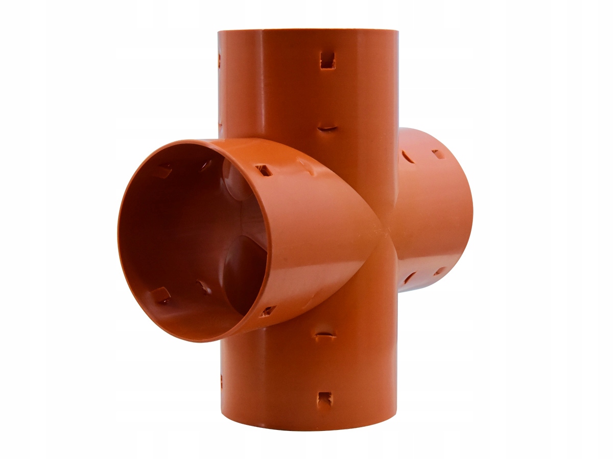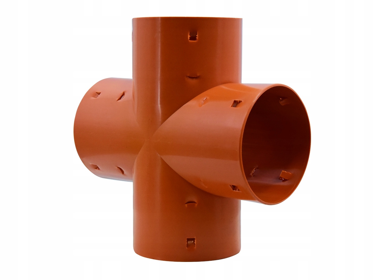 Дренажна хрестовина використовується для з’єднання під прямим кутом чотирьох секцій дренажних труб однакового діаметру. Дренажна труба запресована всередину фітинга.