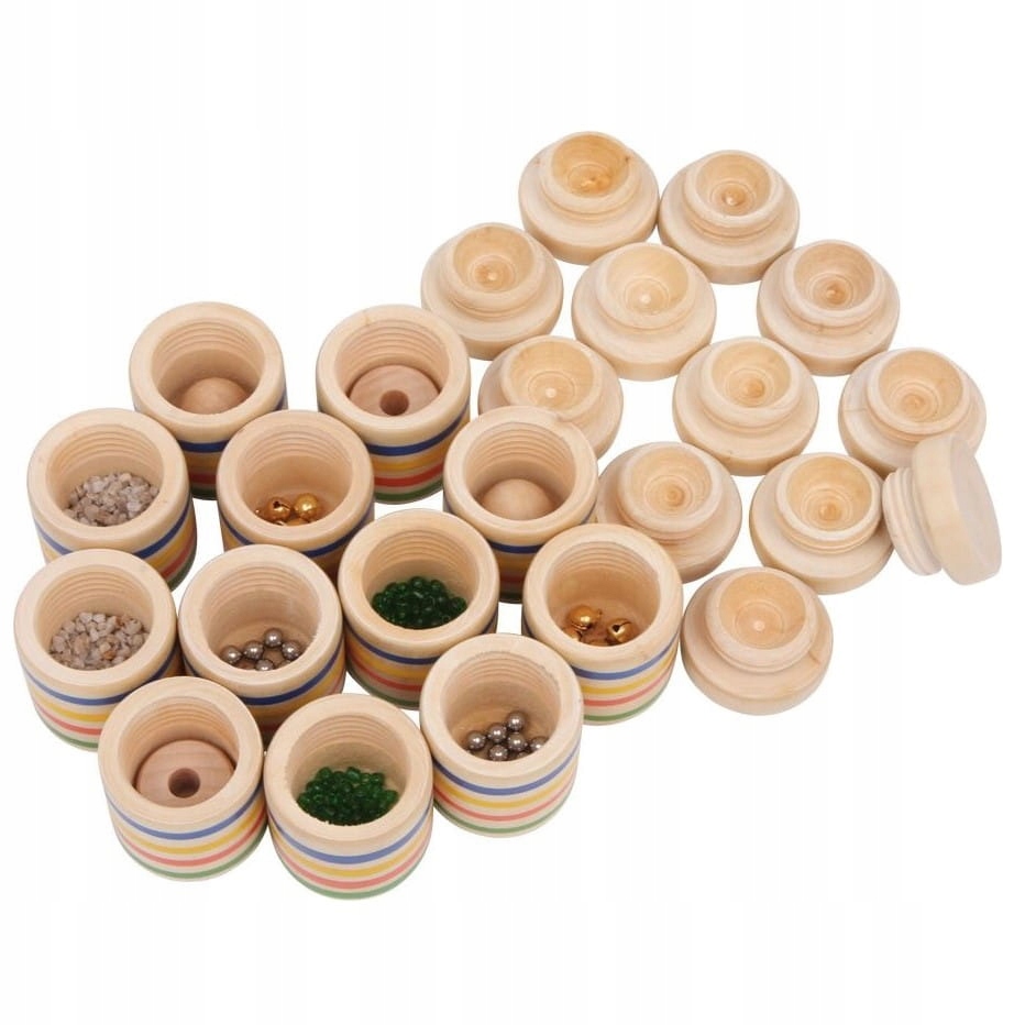 Унікальна гра-пам'ятка, яка використовує слух! Завдання дитини знайти пари - дерев'яні ємності, які видають однаковий звук при струшуванні. Якщо сумніваєтеся, дитина може відкрутити контейнер і перевірити його вміст.