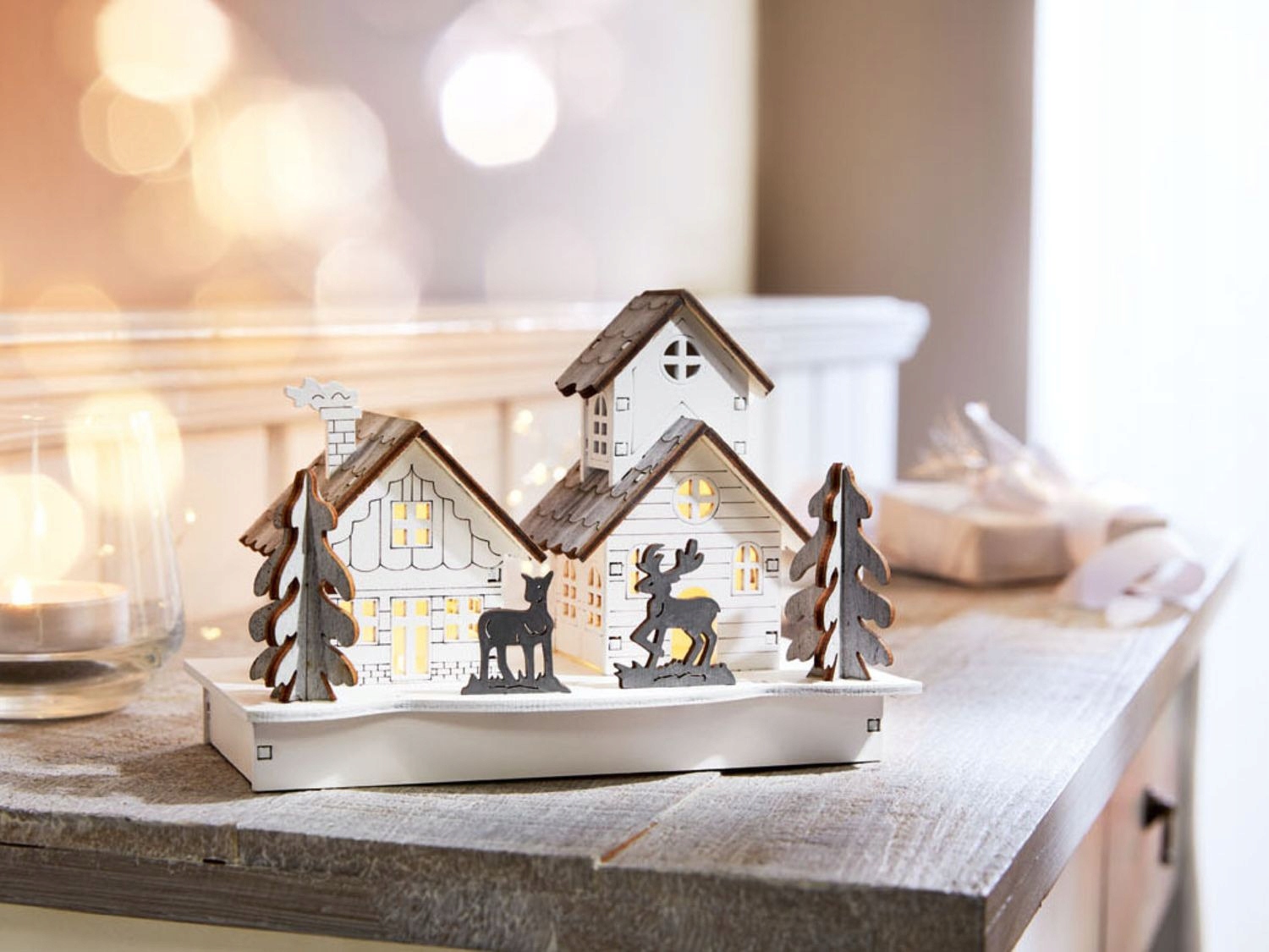DREWNIANA OZDOBA ŚWIĄTECZNA DEKORACJA LED ŚWIECĄCY DOMEK