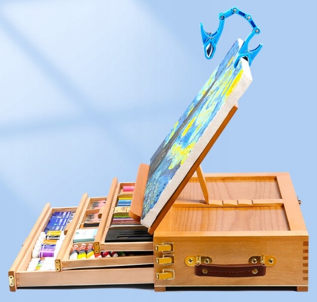 Багатофункціональний мольберт, який виконує багато корисних функцій. Мольберт містить три ящики для зберігання, наприклад, фарб, олівців, фломастерів або пензликів. Що стосується художньої роботи, то все може бути під рукою. Це спосіб залишатися організованим під час малювання, малювання та креслення.