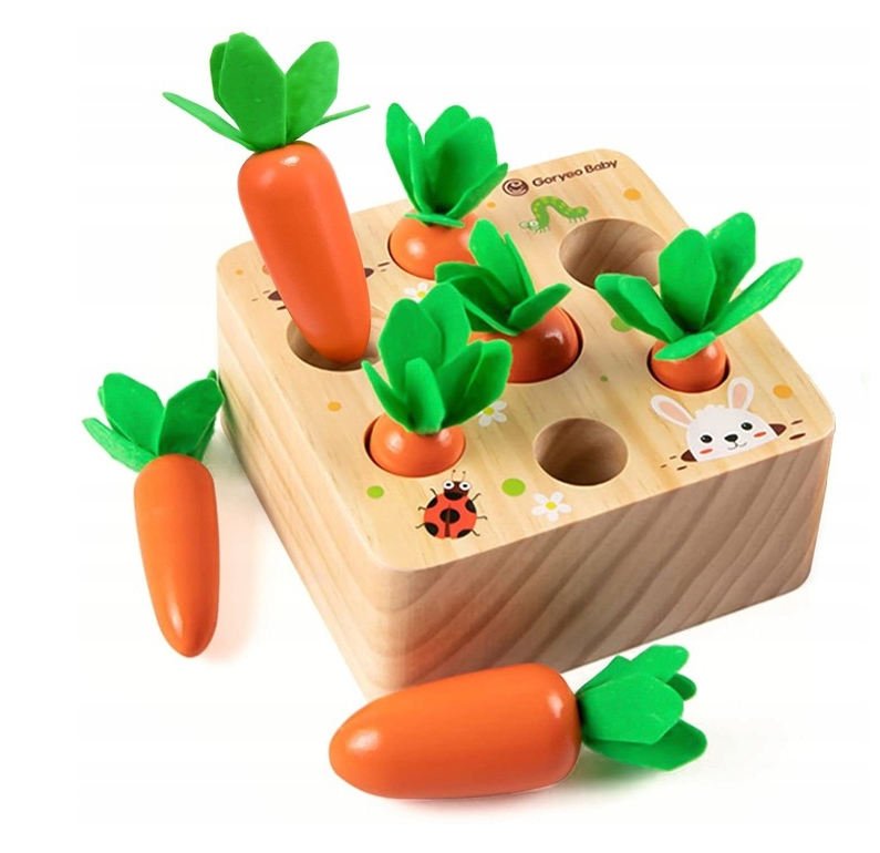 - Іграшка Монтессорі - це розвиваюча іграшка для дітей віком від 1 до 3 років. У набір входить 7 красивих дерев'яних іграшок у формі моркви і дерев'яна основа. Морква – незамінний у побуті овоч, має високу харчову цінність. Їсти більше моркви корисно для здоров’я дитини. За допомогою цієї дерев’яної іграшки батьки можуть заохотити своїх дітей їсти більше овочів, що корисно для їхнього здоров’я.