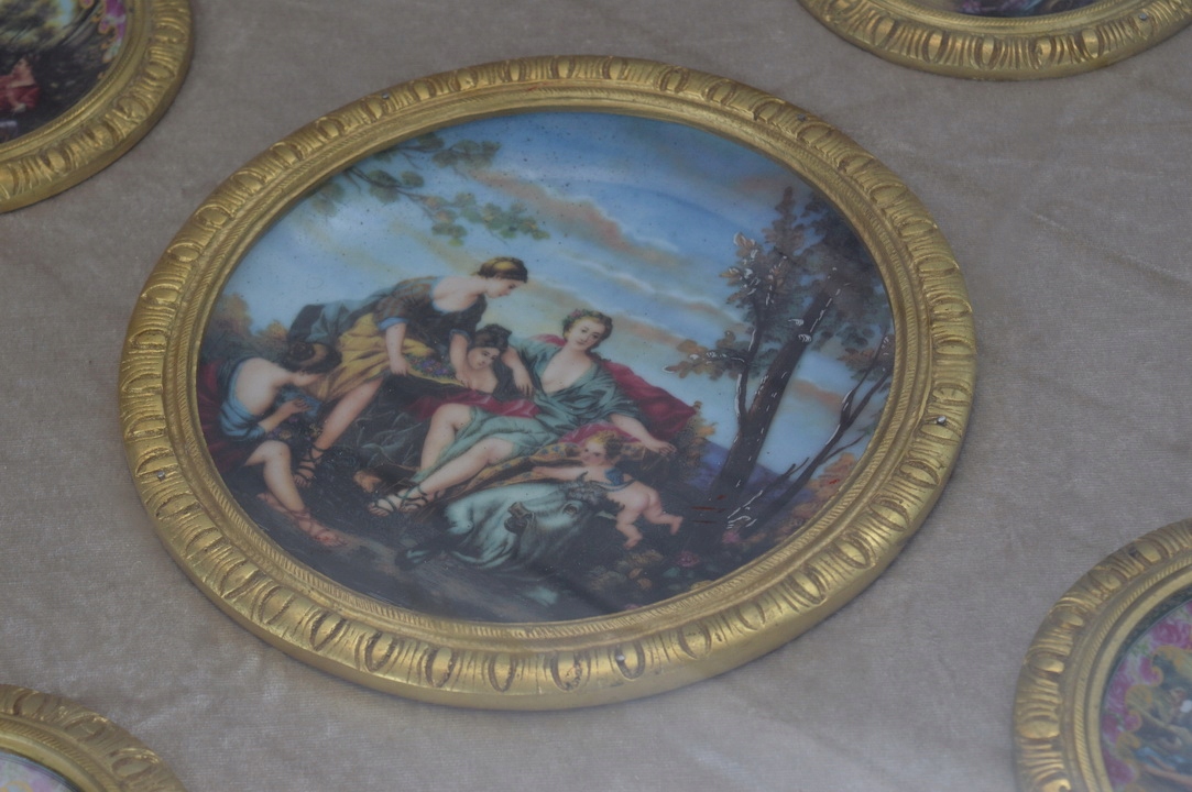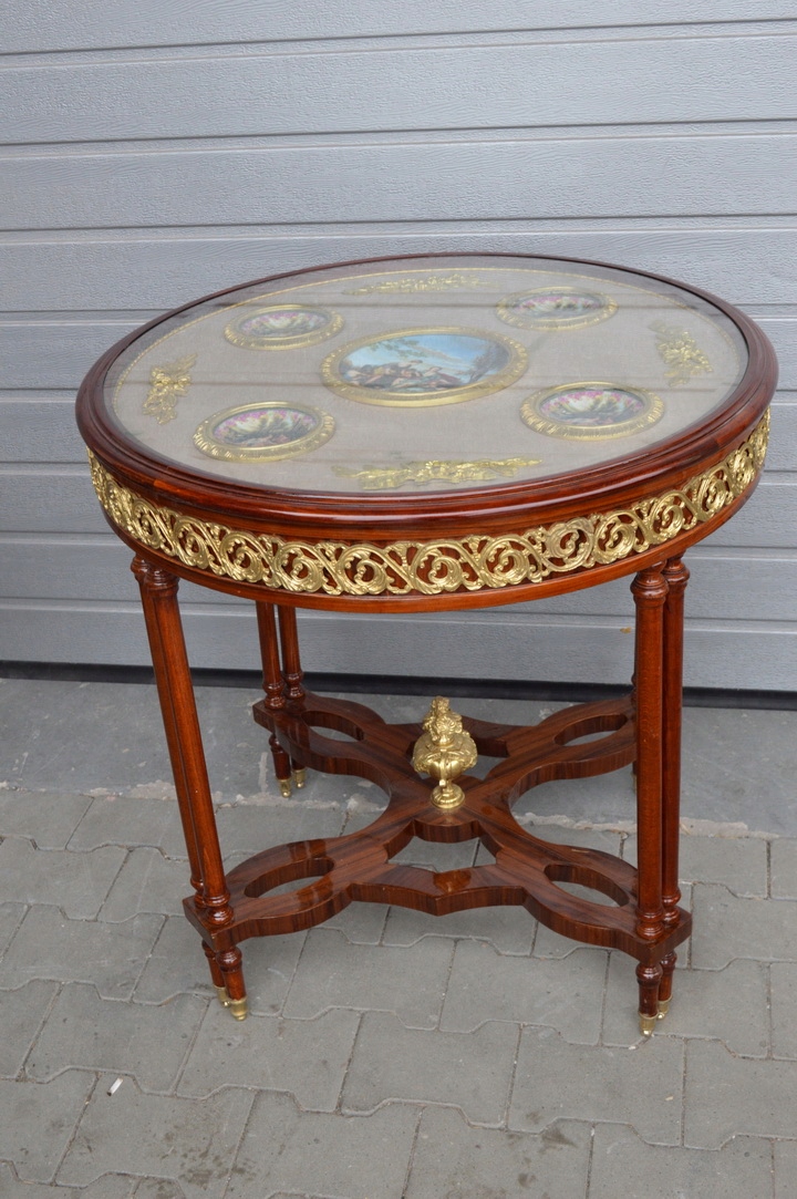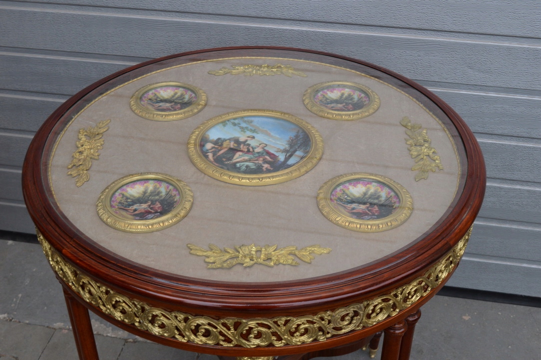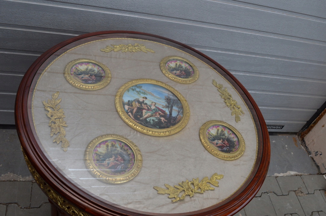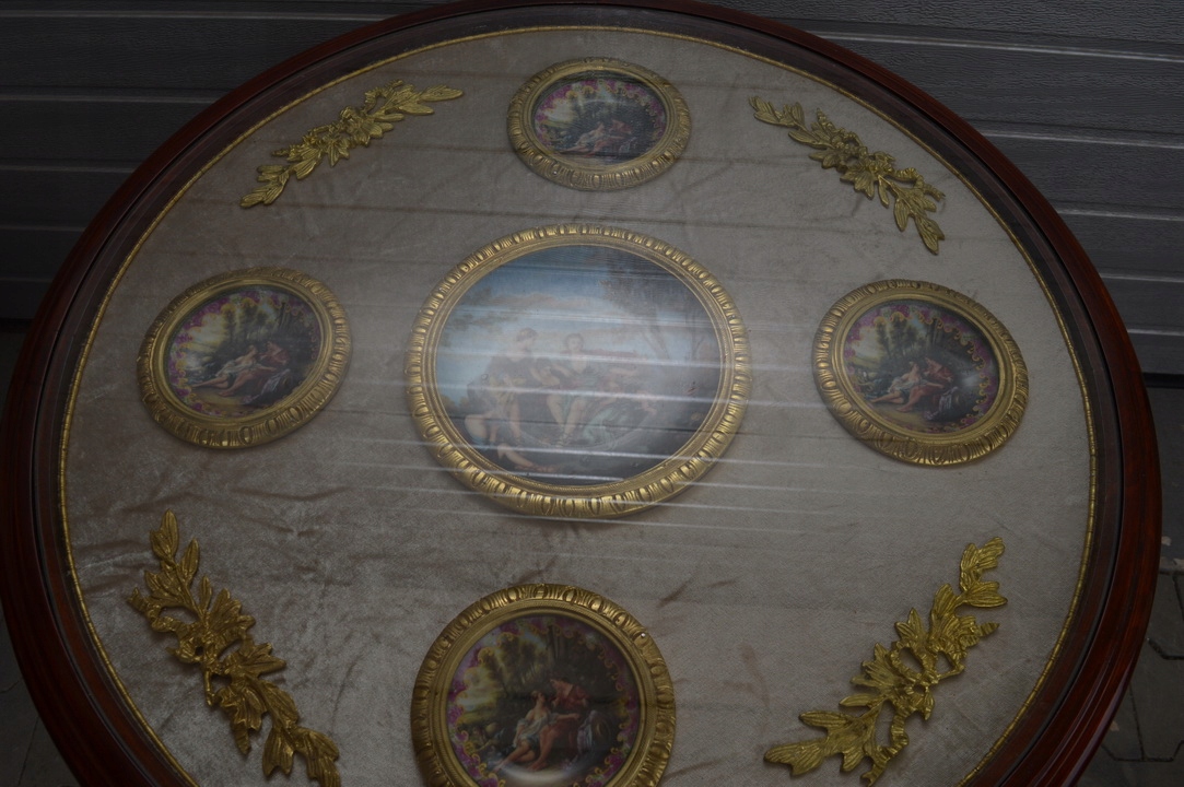 Предметом сьогоднішнього аукціону є неймовірно красивий стіл і підставка для квітів. Верх скляний, під ним 5 порцелянових медальйонів ручного розпису та бронзові прикраси. Решта матеріал - замша.