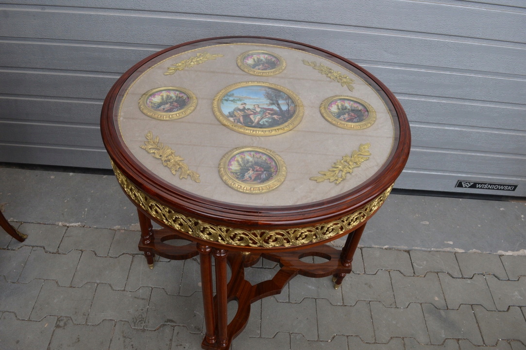 drewno STÓŁ 80X77 stolik MEDALIONY PORCELANA +BRĄZ