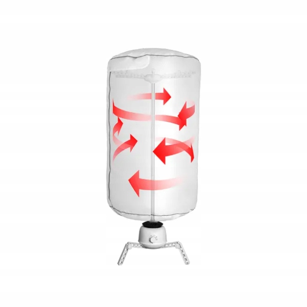 Завдяки своїй вертикальній конструкції сушарка займає дуже мало місця під час роботи, а після використання її можна складати як парасольку та зберігати в шафі. Це ідеальне рішення для людей, які не хочуть займати ванну кімнату чи вітальню традиційною стоячою сушаркою.
