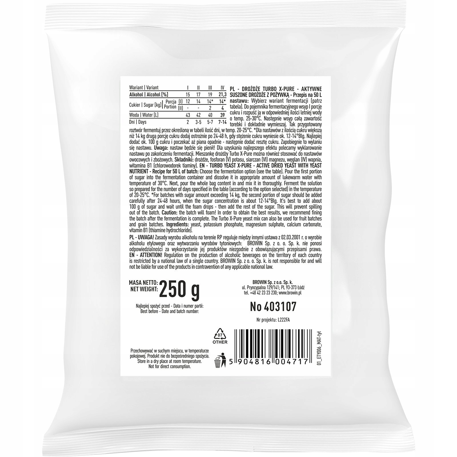 Одного пакетика дріжджів Turbo X-Pure вагою 250 г достатньо для партії 50 л. Залежно від очікуваного вмісту алкоголю достатньо додати від 12 до 18 кг цукру.
