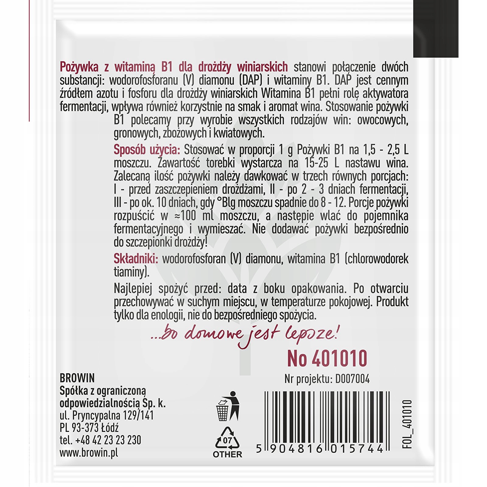 За використовуючи живильну речовину з вітаміном B1, ми отримуємо відповідне розмноження дріжджів, швидкий початок бродіння, а також повне згасання цукру, що міститься у фруктах і додається під час виробництва вина. Вітамін B1 стимулює ріст дріжджів і є сильним активатором бродіння, тобто забезпечує його швидший початок.